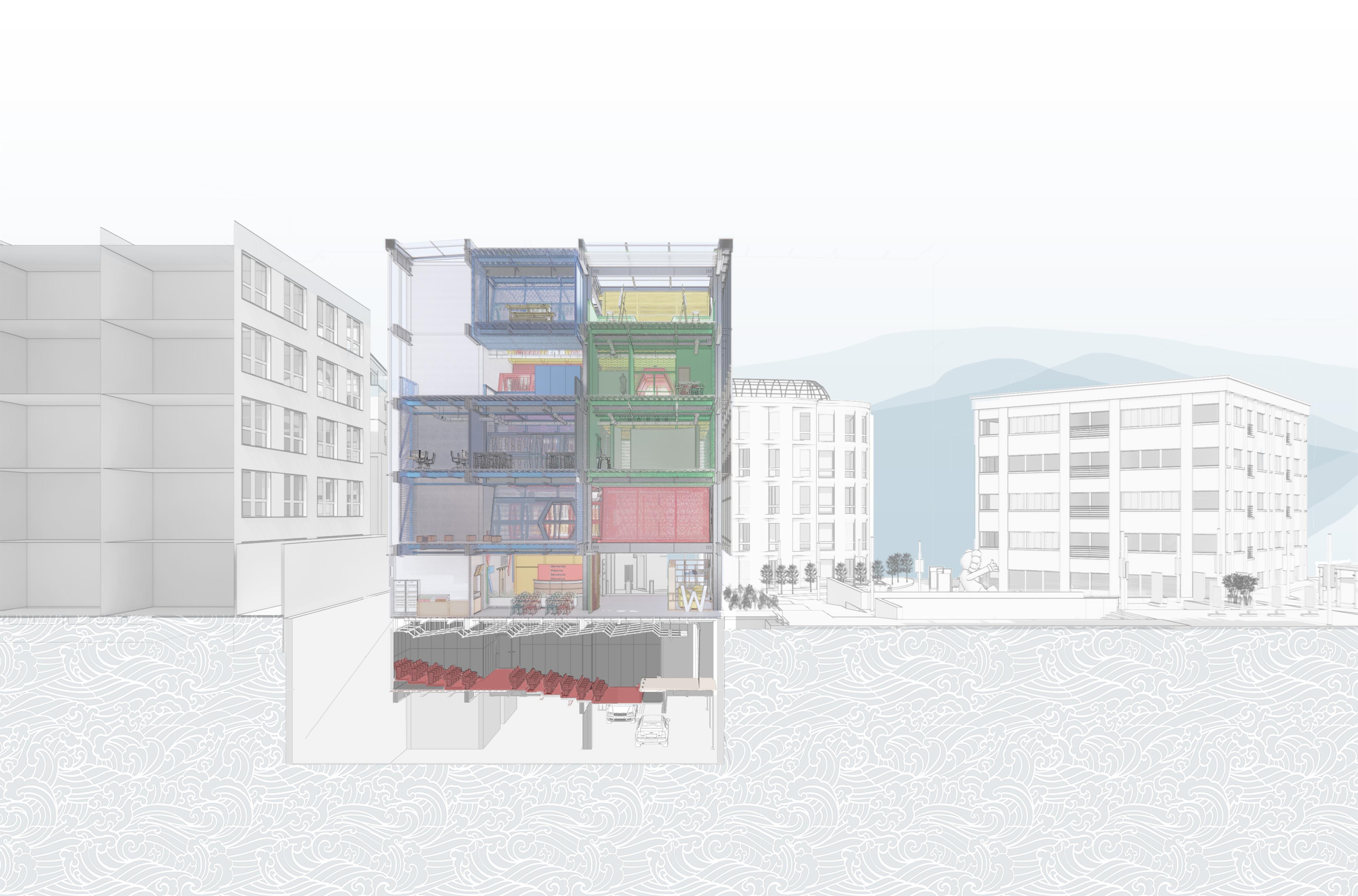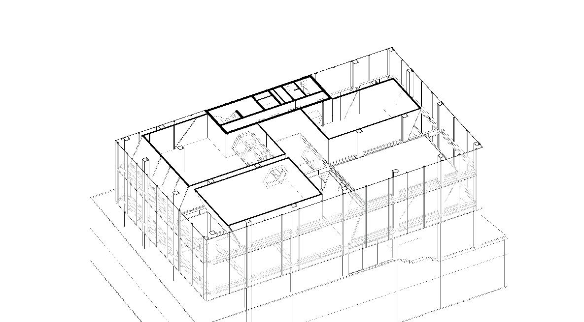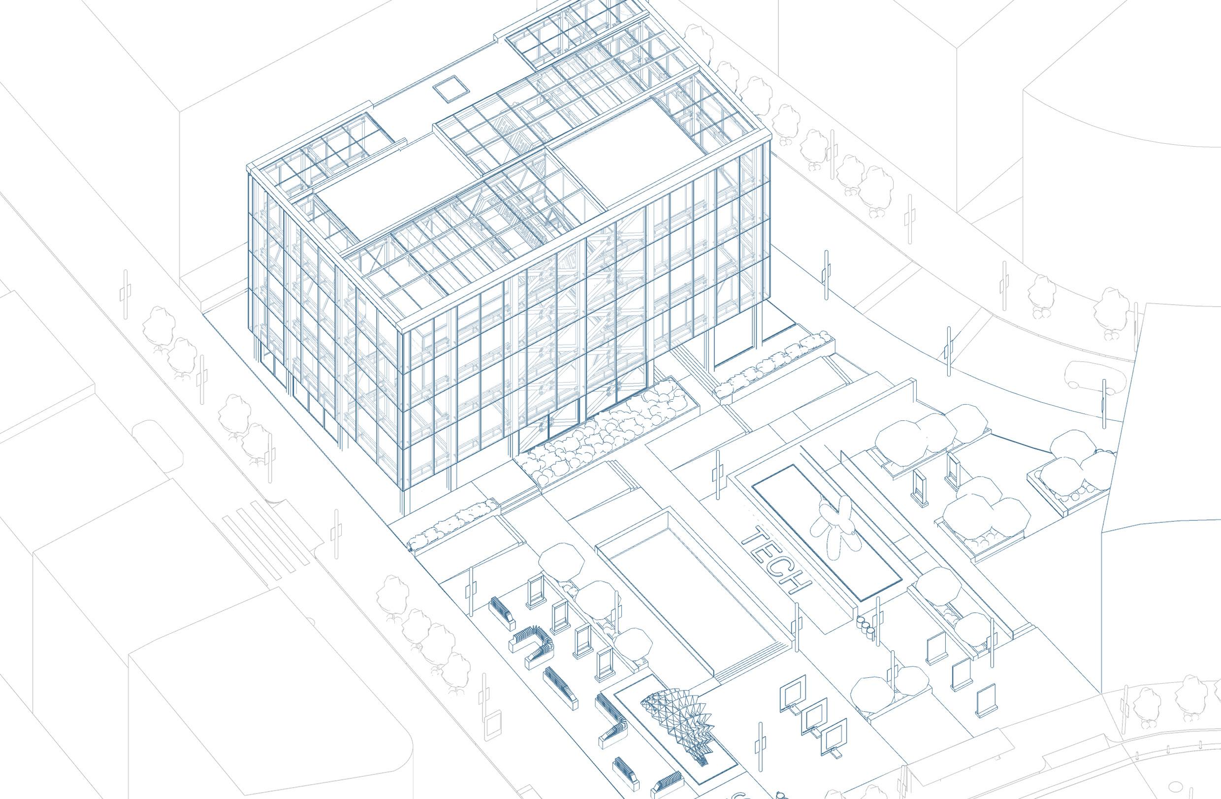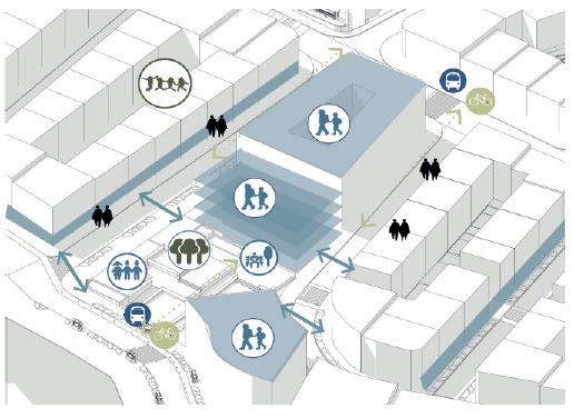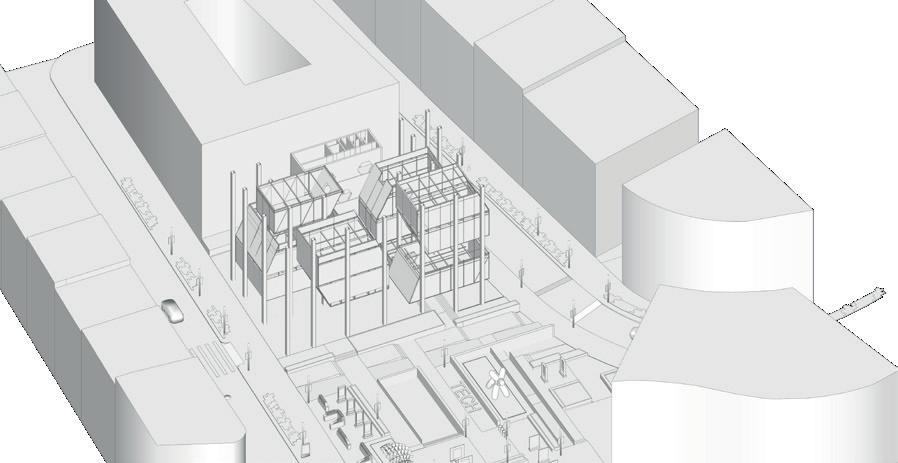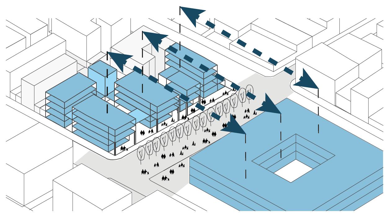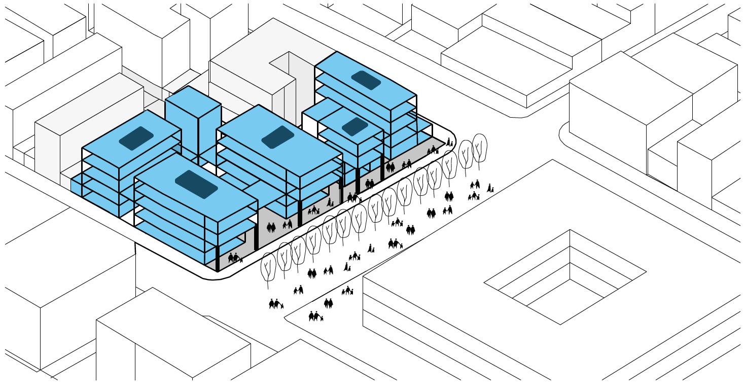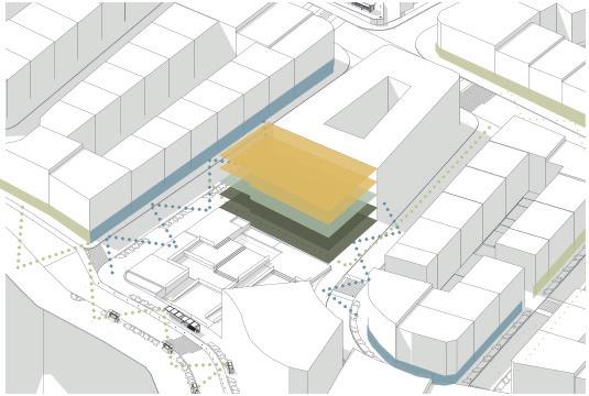 Se libera la planta baja, elevando las actividades a los pisos superiores. El espacio público se vuelve contínuo y se conecta con la zona
