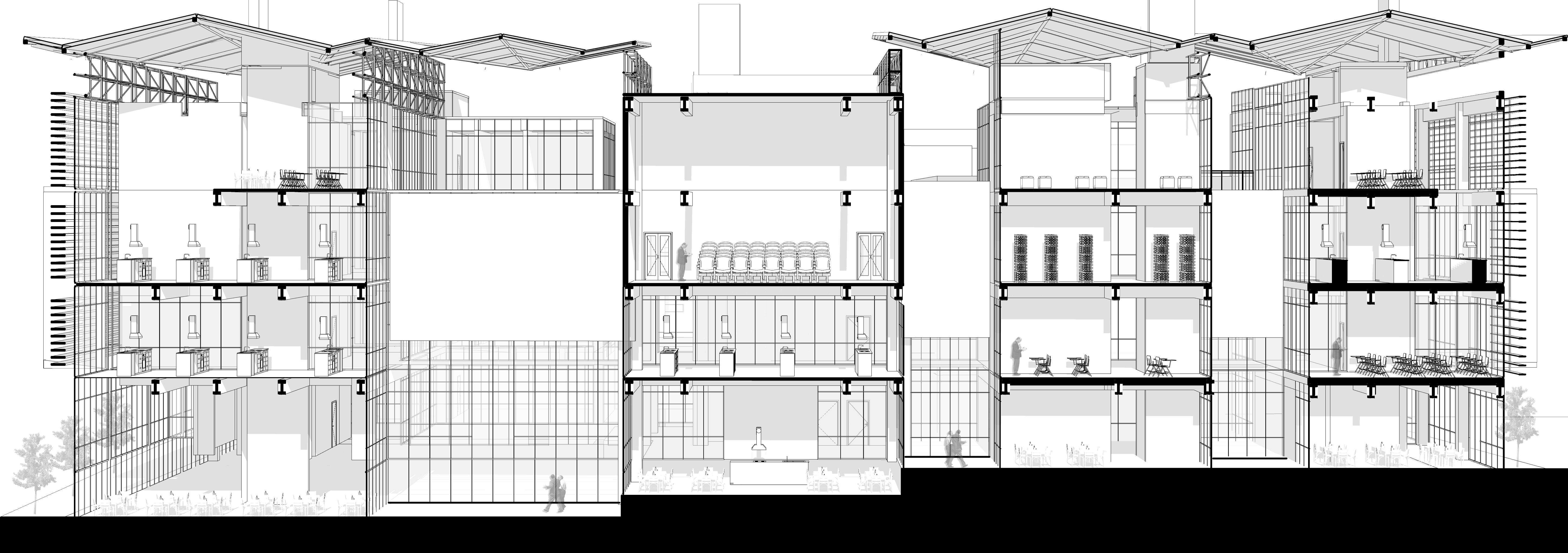 Se recuperan 2 edificaciones existentes y se plantean 2, todas se relacionan mediante circulaciones que cruzan el proyecto