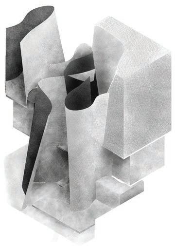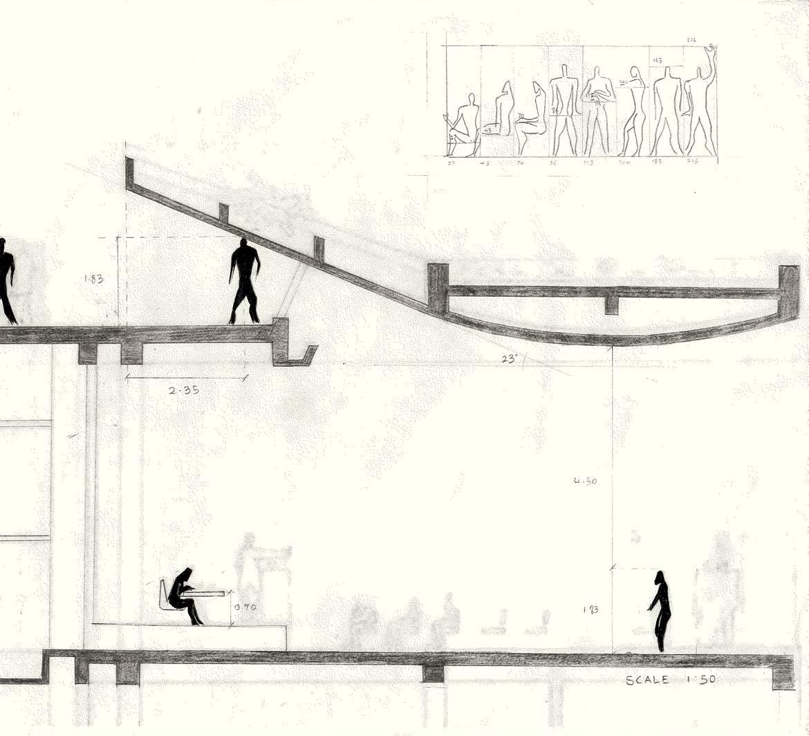 CONCEPTUAL SIMILARITIES WERE FOUND IN THE FUKITA PAVILION BY RYUE NISHIZAWA. AN EXPLORATION OF SPACE RELATIVE TO THE HUMAN SCALE AND THE ABSOLUTE LIMITS OF HORIZONTAL AND VERTICAL SPATIAL EXPERIENCES WAS CONDUCTED THROUGH PARTI MODELS OF THE PAVILION. THE UNASSUMING LAYERING AND FOLDING OF STEEL PLATES, WHEN ASSESSED FURTHER, REVEALS AN AVERSION FROM SOLID LINES WHEN POCHÉD AND TRANSITIONS BETWEEN SPACES OF INFINITE POSITIVE/NEGATIVE VERTICAL EXPERIENCES OF SPACE AN UNDERSTANDING OF SPATIAL EXPERIENCE AS A PERCEIVED AND CONTROLED ARCHITECTURAL QUALITY WAS GAINED THROUGH THESE EXPLORATIONS. AN EMPHASIS IS ALSO PLACED ON THE INCLINATION TOWARDS VARIETY IN THE TOPOLOGICAL SCHEME TO ACHIEVE AMBIGUOUS AND NON-HIERARCHICAL SPACES