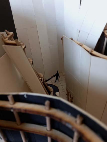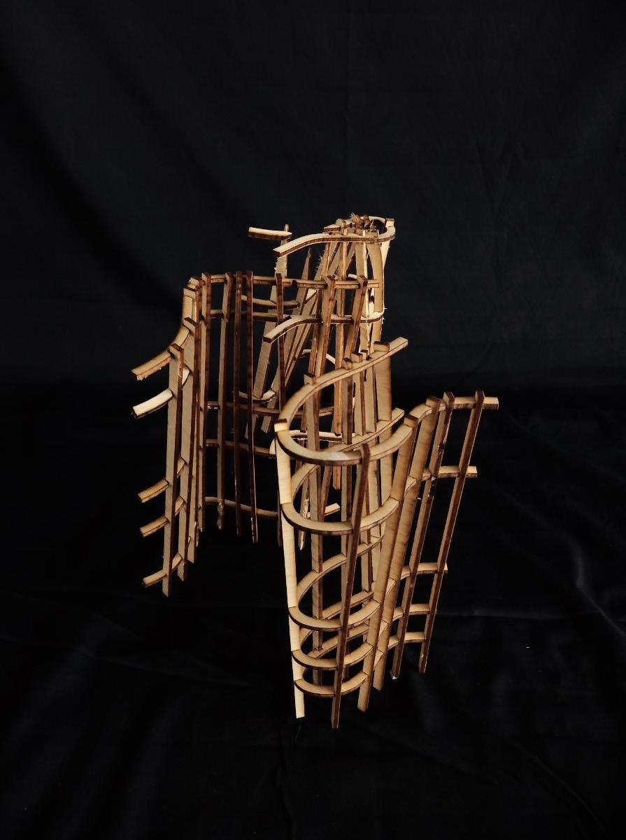 EXPERIMENTS WITH THE INTERNAL FORMWORK WERE CONDUCTED TO TRANSFORM THE STEREOTOMIC FORM TO HABITABLE SPACE. WAFFLING WAS FOUND TO BE THE MOST ACCURATE METHOD TO RECREATE THE COMPLEX GEOMETRIES THAT WERE COMPUTATIONALLY GENERATED. IN LINE WITH THE CONCEPTUAL GROUNDINGS OF THE DESIGN, EACH WAFFLE LAYER CORRELATES TO A DATUM HEIGHT WITH A SUBSTRUCTURE CONNECTING EACH UNIQUE MODULE. NON-DIRECTIONAL DOWEL STRUTS WERE USED AS THE SKELETON OF THE WAFFLE. EACH DOWEL MEMBER WAS PRECISELY POSITIONED SUCH THAT THEIR SEPERATION LIE WITHIN A DOMAIN THAT ALLOWED FOR EASY ASSEMBLY OF PREFABRICATED PANELING. A PANEL CLADDING WAS THEN FASTENED TO THE WAFFLE ON THE SIDE CORRESPONDING TO THE ANGLE OF DIRECT SUNLIGHT REFLECTION. AS SUCH, THE DESIRED MANIPULATION OF LIGHT USING SWEEP WAS ACHIEVED.