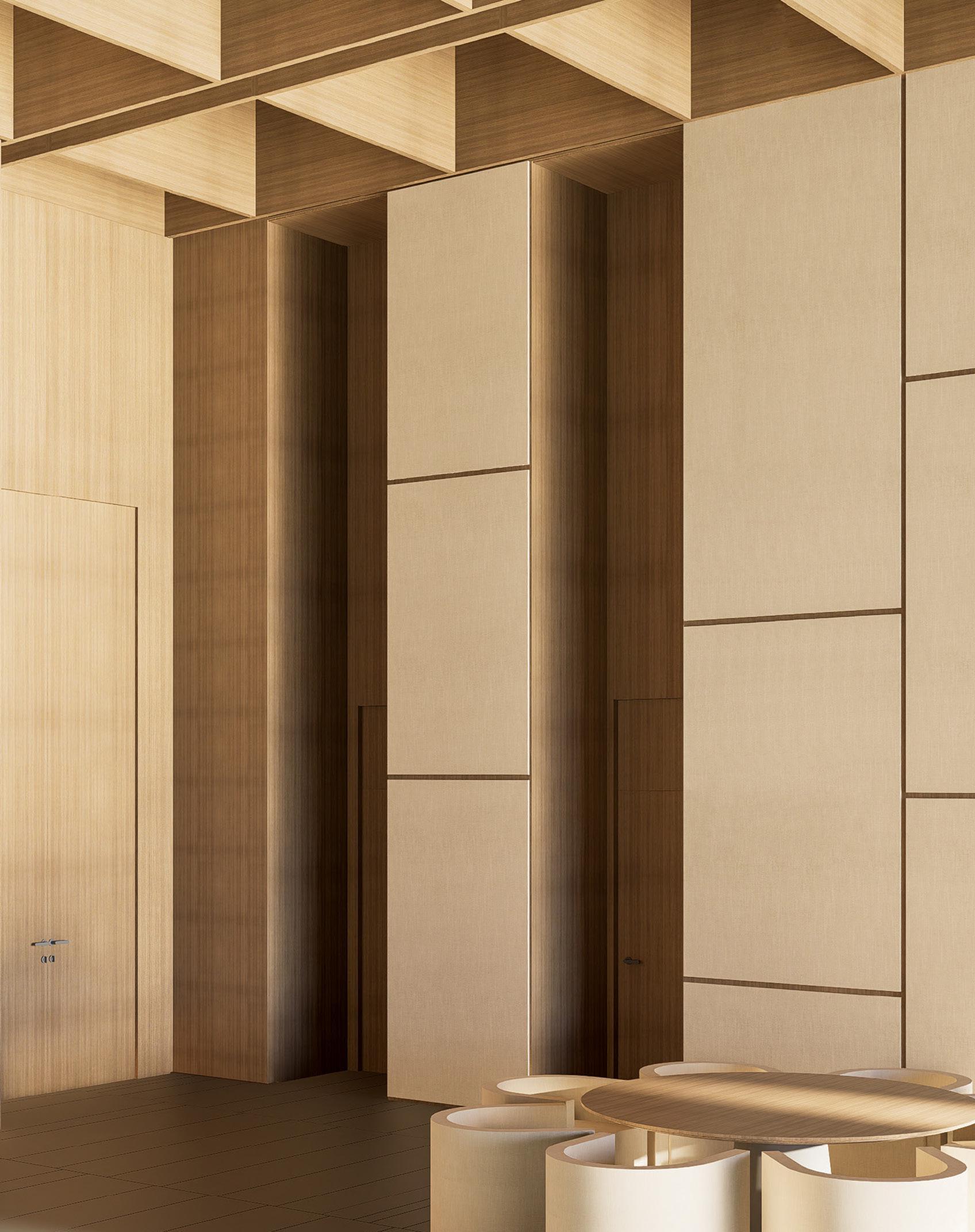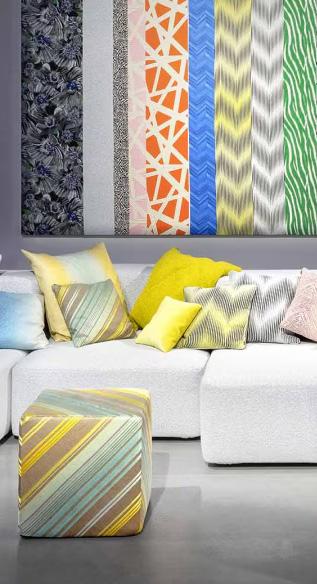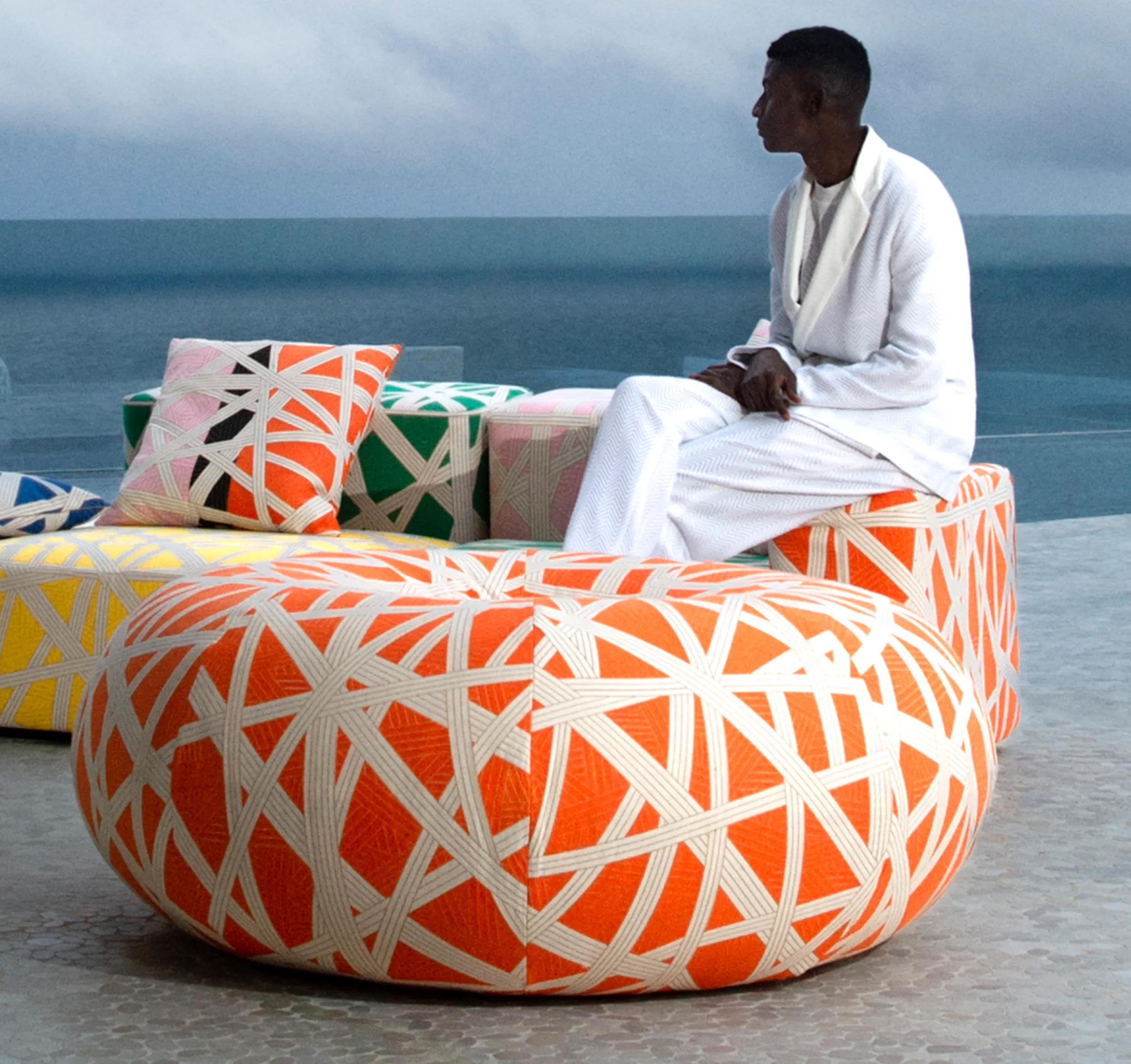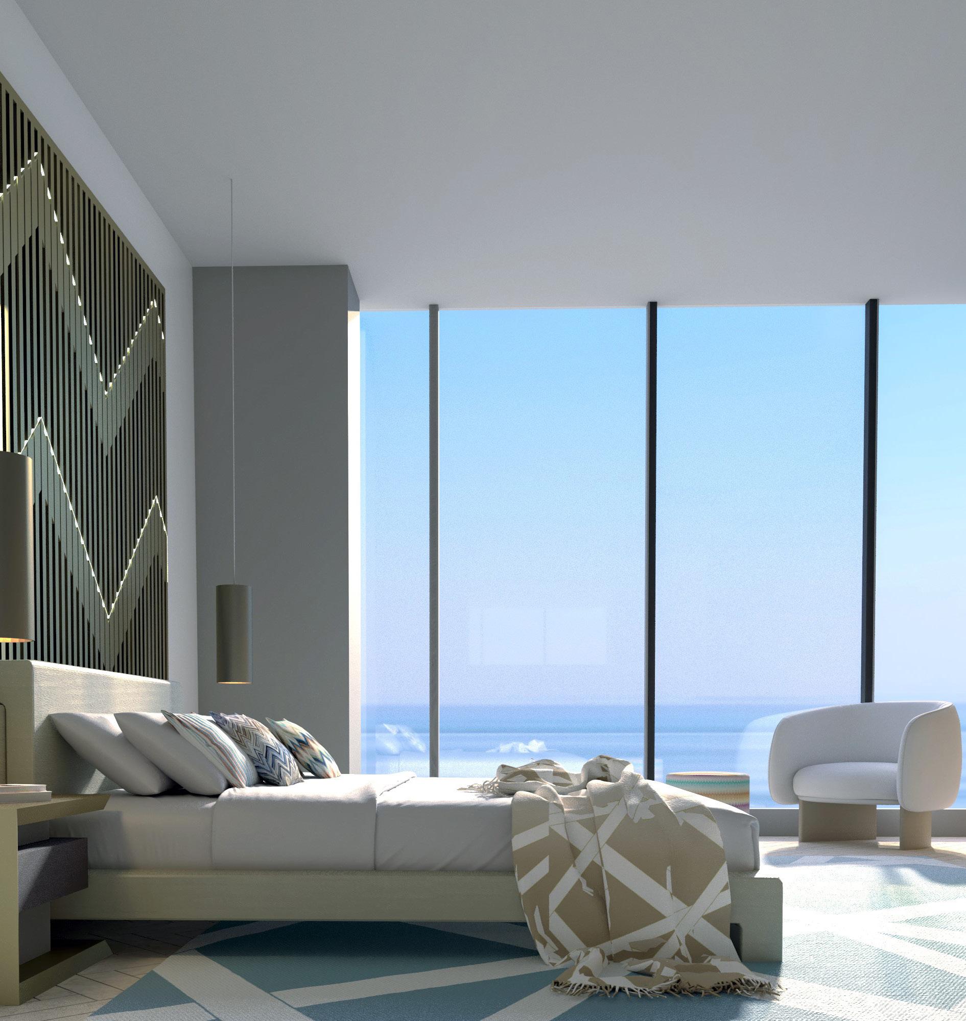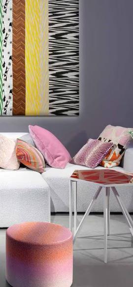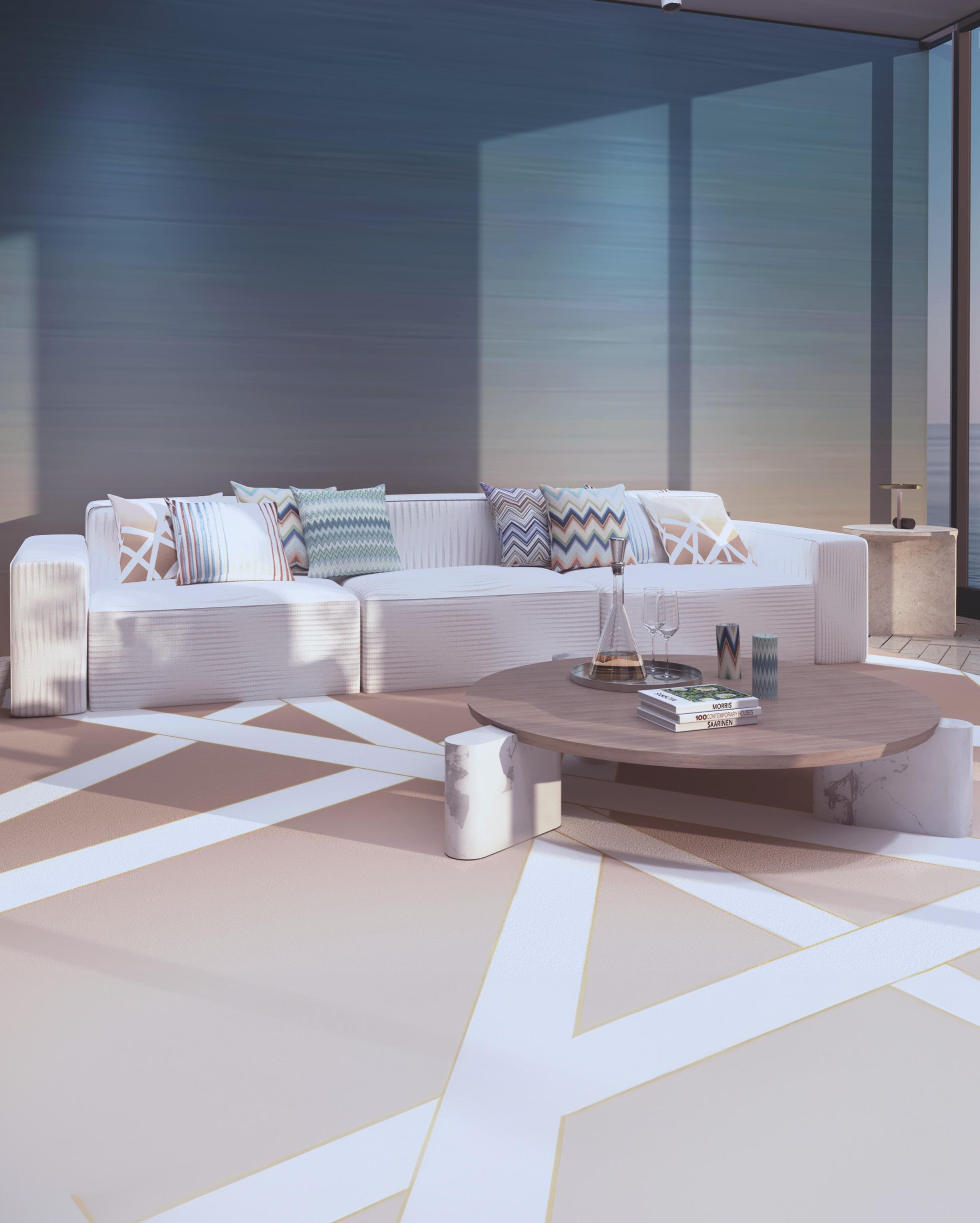 I motivi Missoni sono abilmente combinati per creare uno spazio complesso ma coerente. Motivi audaci e colorati si armonizzano con serene tonalità di blu turchese e beige sabbia, dando vita a un’esperienza visiva dinamica e affascinante.