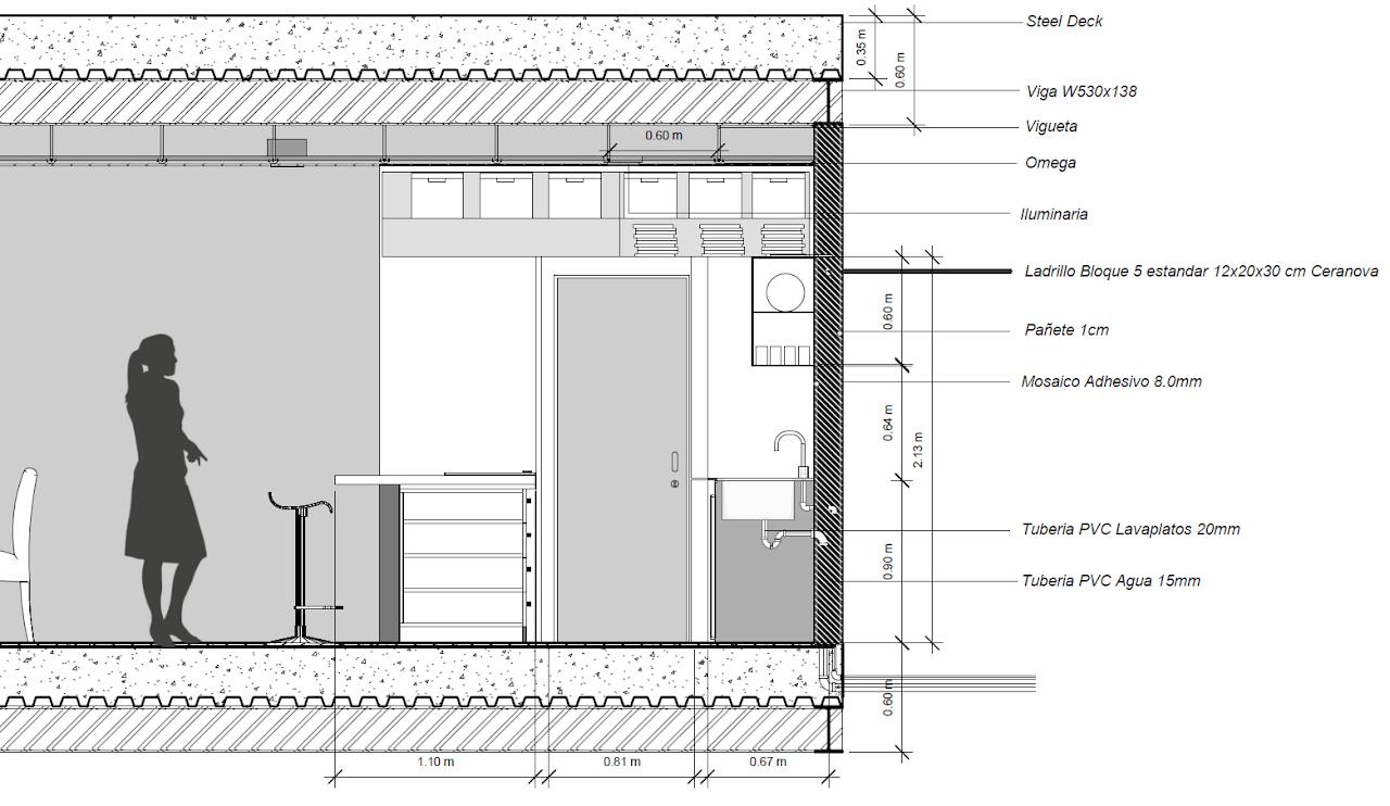 En busqueda de entender mejor el espacio se realizó el corte traversal de la cocina (apto 170 m2) que es un espa donde se encuentra una isla en el centro con los fogones, cajones y sillas de tipo bar. Posterior a la isla se hubic marcos correspondientes donde se guardan los vasos y platos como indica el dibujo. En este mismo lado ubic correspondientes (Corte en detalle, tuberÃas, achurrado de muros) y en este mismo lugar se enseña toda la parte e como lo es los muros, el detalle del perfil viga, el steel deck y el acotamiento de segmentos.