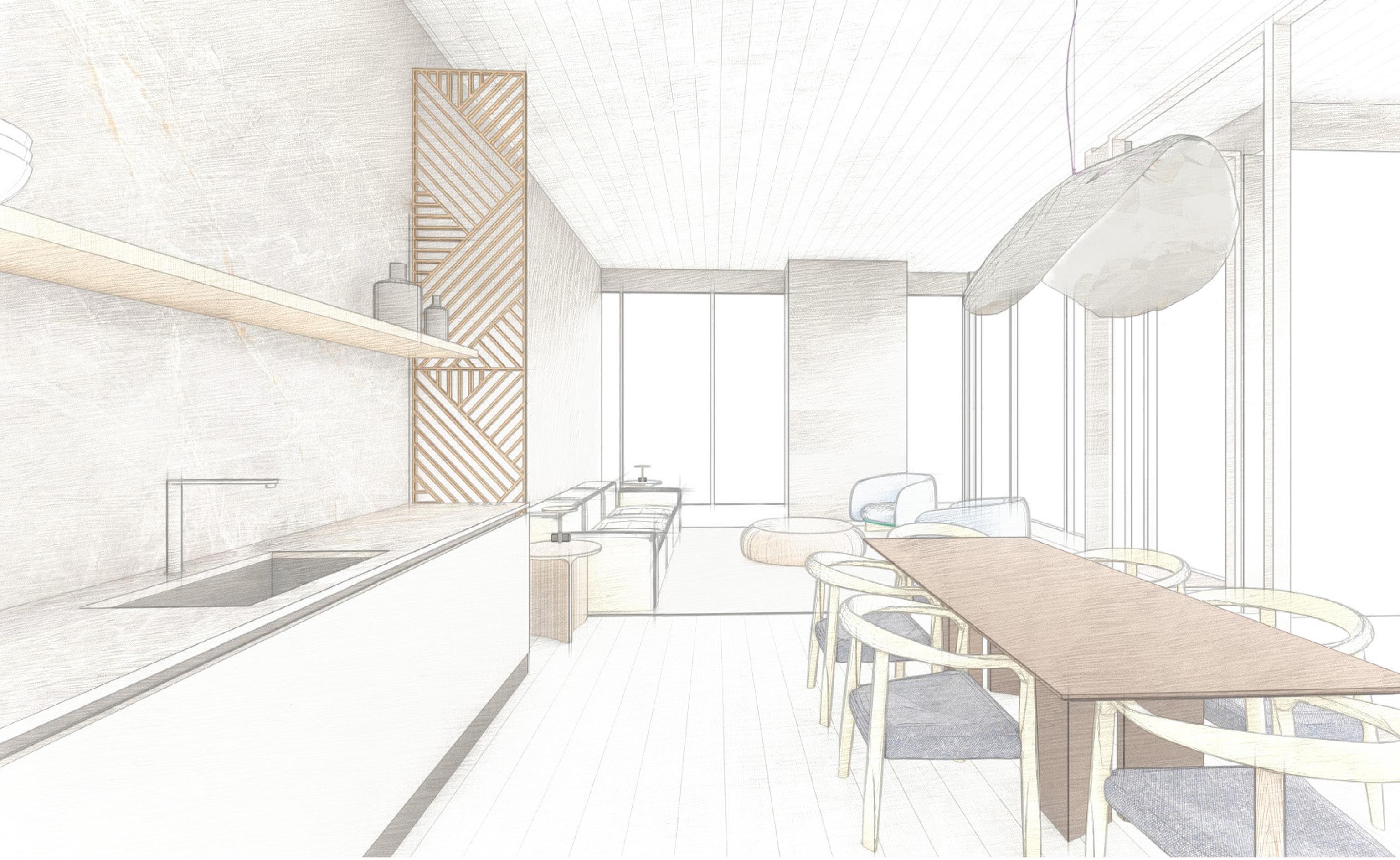 Proposta In an effort to better understand the space, a transversal section of the kitchen (170 m² apartment) was made, showing an open area with good lighting. The central island includes stoves, drawers, and bar stools. Behind the island, the cabinets have frames for glasses and plates. This side also includes the sink and structural details like walls, beams, and steel deck.