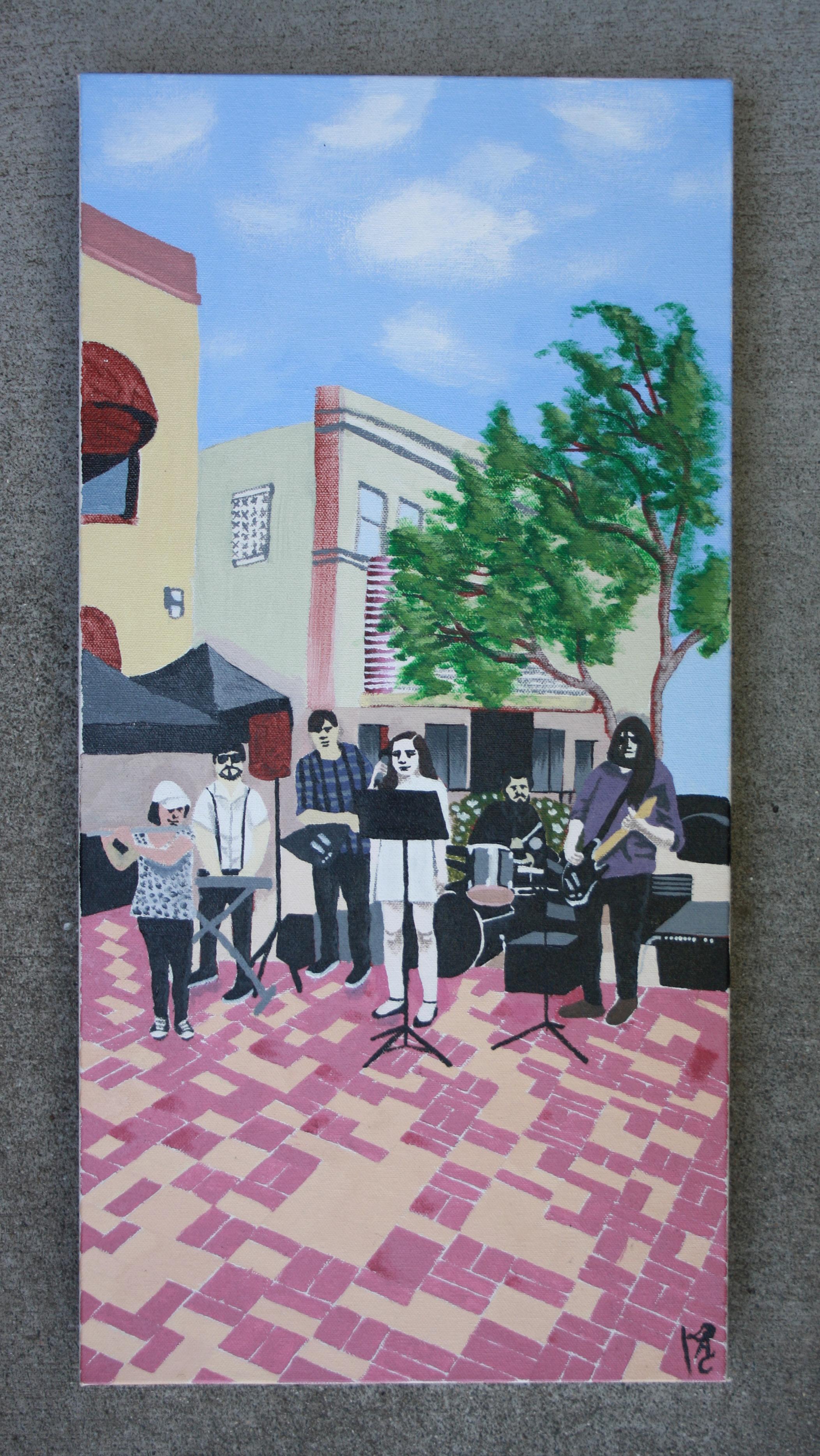 One of my best friends used to be in a band called Beach on Mars. They were dedicated and would practice for hours together after high school classes. There were six band members. A bassist, a guitarist, a drummer, a keyboard player, a flute player and a singer, who is my close friend. One day, they invited me to go listen to them play in downtown Santa Ana, during the summer. I always enjoyed listening to them. To thank them for their performance, I decided to paint this artpiece and gift it to them. Time passed, they grew up and all went their separate ways. The performance I saw, became the last song. All their memories were left in this piece.
