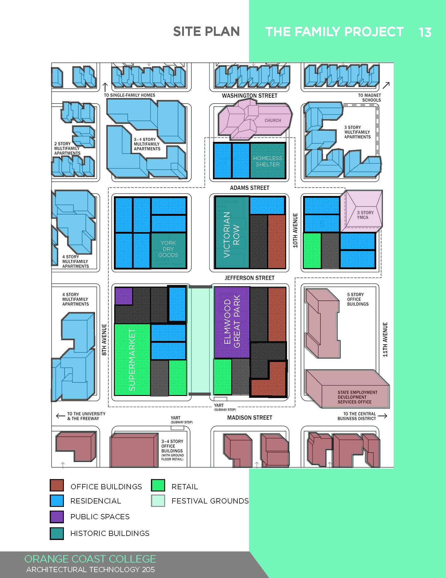 This class was divided into six groups, all competing against each other to propose an urban plan to investors to redevelop a deteriorating city. Our group's name was the Family Project and the goal was to revive Elmwood, a fictional city, by providing a community centered take on the town’s historic preservation. This project aimed to create a vibrant, eco-friendly environment that met the needs of its residents and tourists. There were challenges facing Elmwood's future and fear sparked uncertainty. Our team had five members each with different roles. My role was the site planner and team manager. I determined what type of building was needed and where it went on the site. I created the 3D model you see on this cover image. After thoughful consideration we came up with our project, Mod.c.
