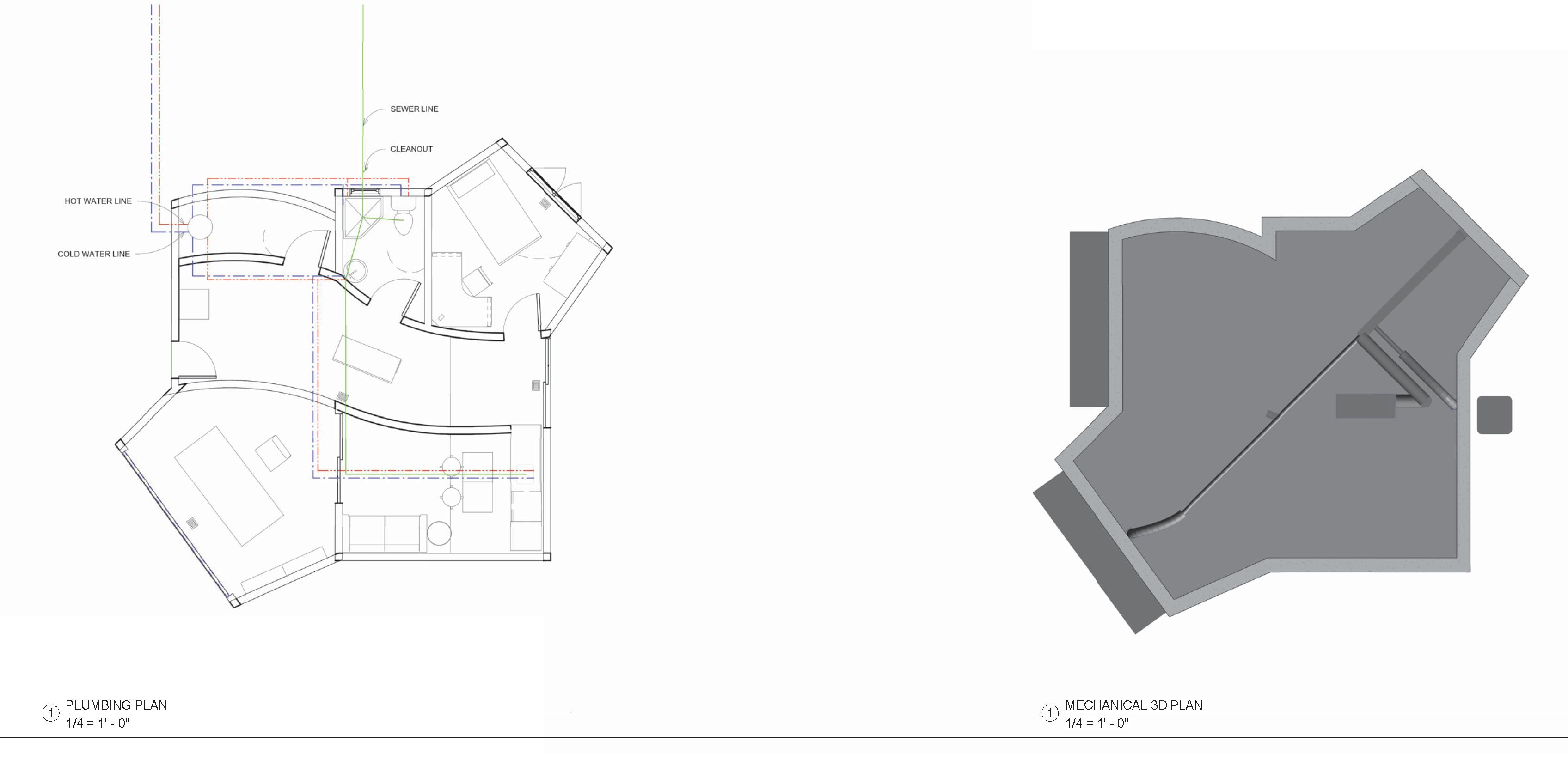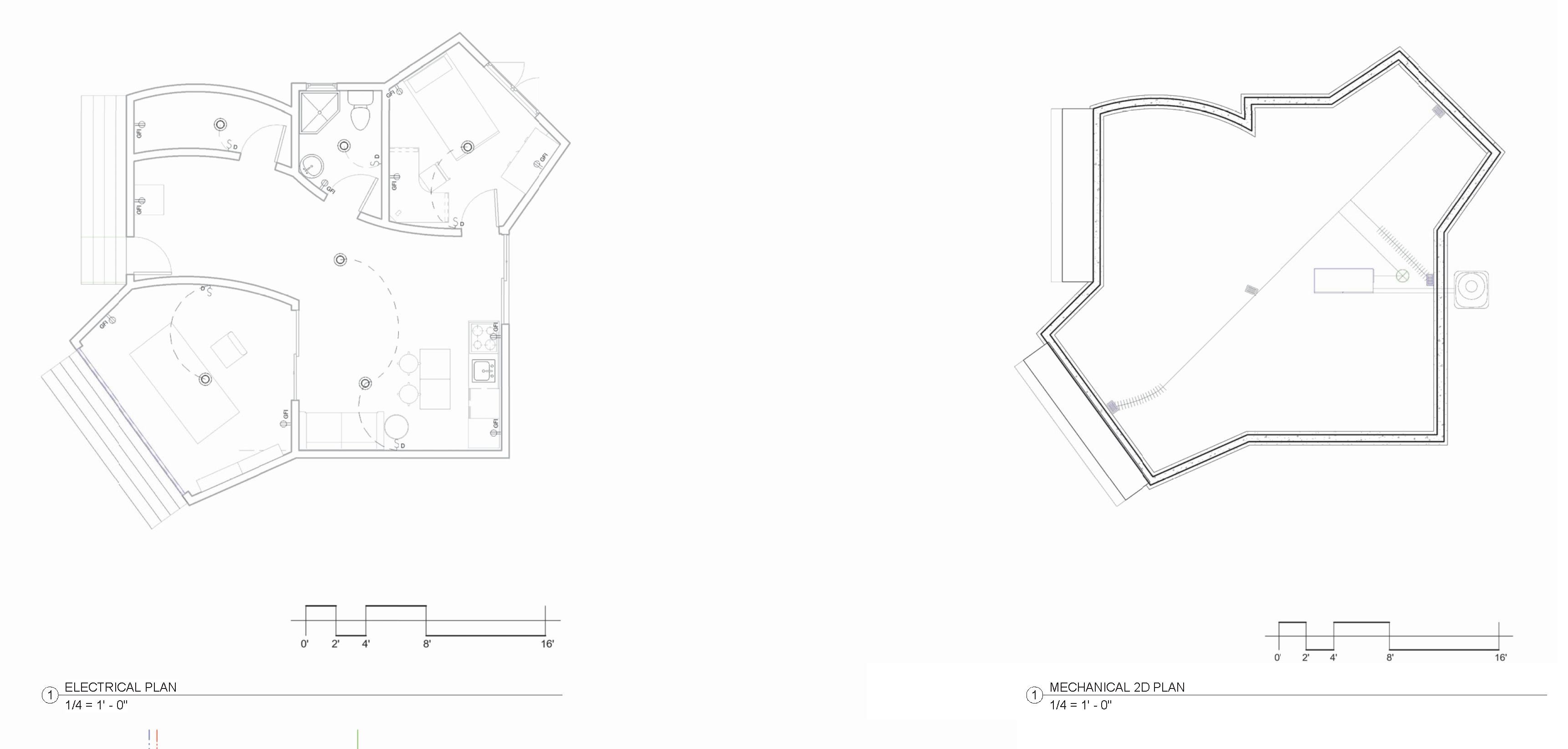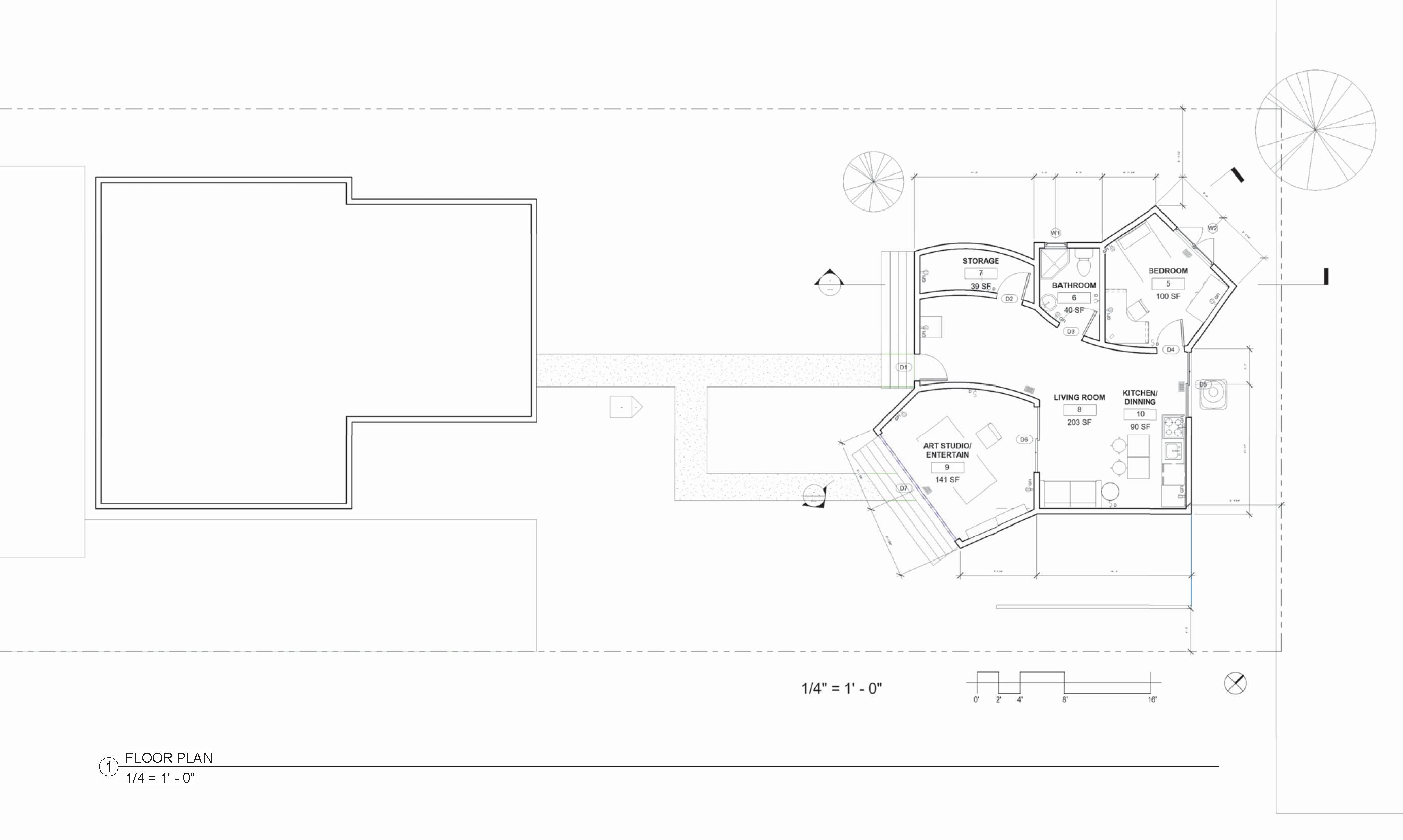 Flow, energy, and human connection are what inspires the artist “Nuge,” to craft such captivating artwork. His art is a rebellion to his architectural background. He creates organic forms of wood that are in stark contrast to the hard lines and rigid nature of the built enviornment. “Nuge” was in need of an aditional dwelling unit where he was free to formulate his masterpeices without distractions. The ADU will be placed just outside his residence In Costa Mesa, California. This would serve his purpose as an art studio and guest living space. Advancing this idea of flow and energy which manifest a genuine human connection, this project incorperates those elements through the use of organic structural forms. The floor plans and facade are round and smooth which are the complete opposite of what “Nuge” describes architecture to be. This project would serve it’s purpose as an art studio and guest living space which advances “Nuge’s” artistic vision.