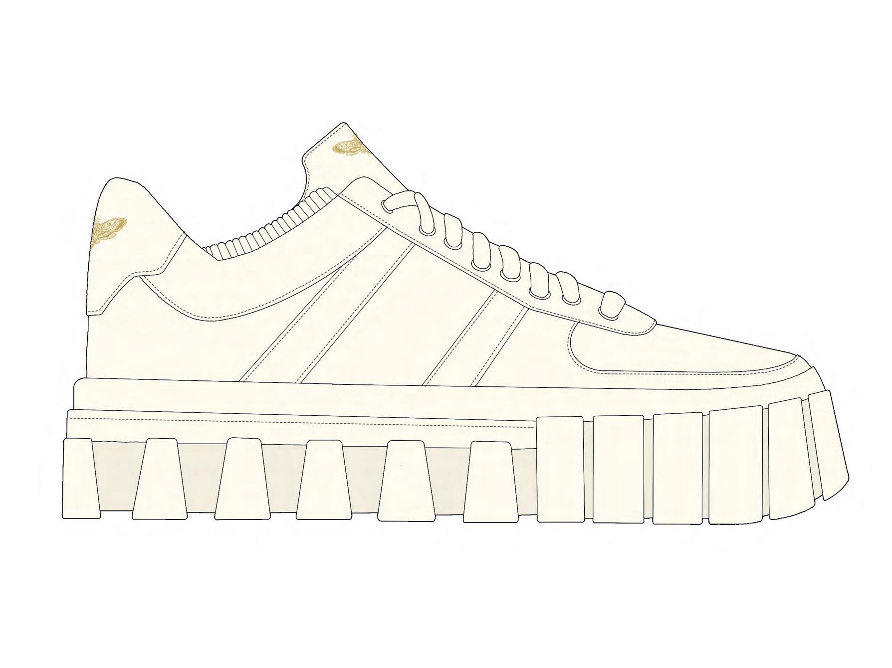 Baskets en cuir de veau blanc lisse au bout arrondi. Grands lacets plats et symbole de la collection en couleur or sur la languette et le talon. Grande semelle en caoutchouc.