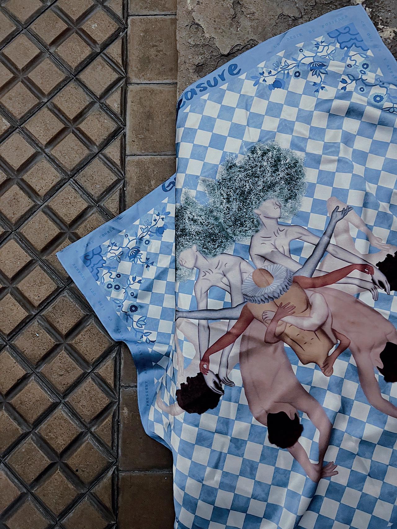 FOULARD DÉSIR Carré double face en twill 100 % soie roulotté à la main.