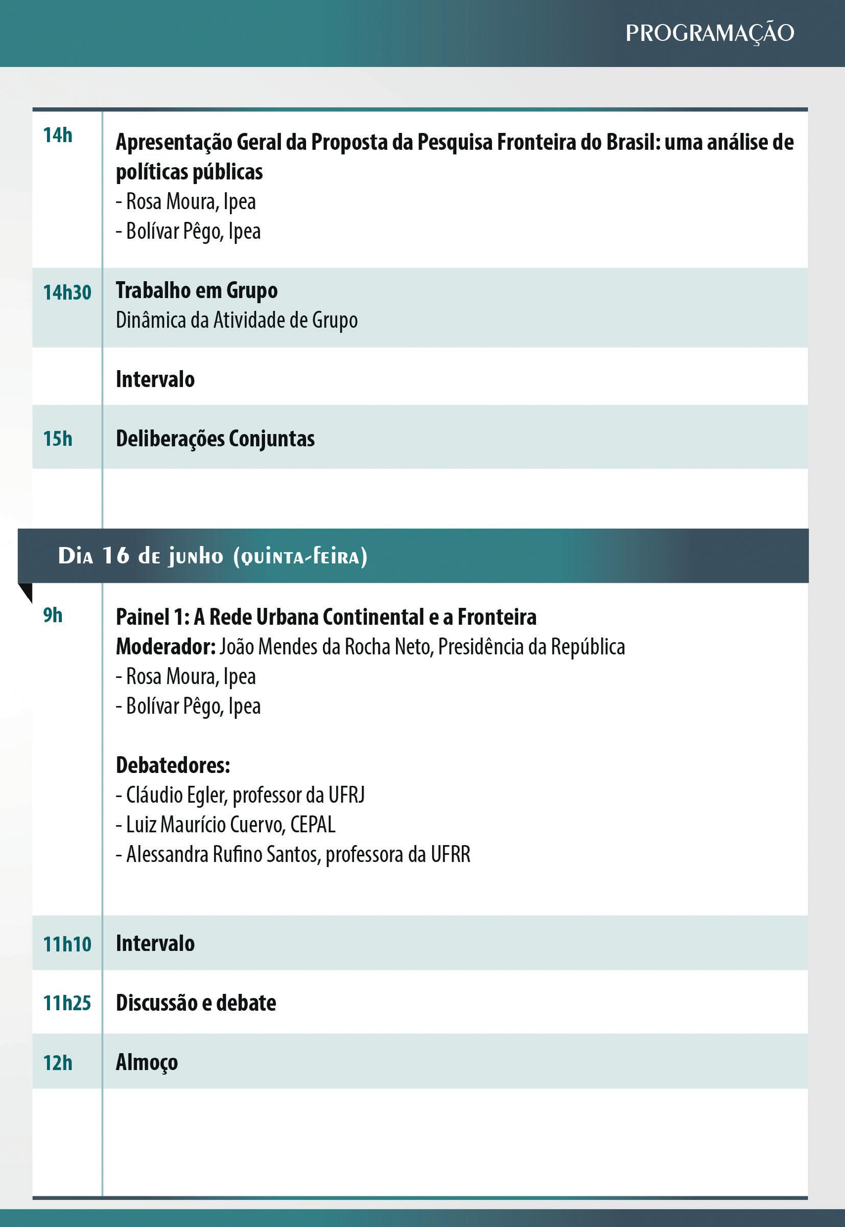 Essa oficina de trabalho foi organizada pelo Ipea, em parceria com o MI, e contou com a presença de pesquisadores, integrantes de diferentes ministérios, representantes dos núcleos de fronteira dos estados que fazem fronteira com países sul-americanos e membros de órgãos internacionais da América do Sul3. Durante dois dias, manteve-se uma profí cua sequência de apresentações por palestrantes, seguida de observações por debatedores convidados e debates abertos ao público participante, envolvendo temas como pesquisa e políticas públicas para a fronteira, fronteira e integração regional, fronteira econômica e social sul-americana, fronteira como instrumento do desenvolvimento sul-americano, as diversas fronteiras brasileiras, rede urbana continental e a fronteira e rede urbana nacional e a fronteira.