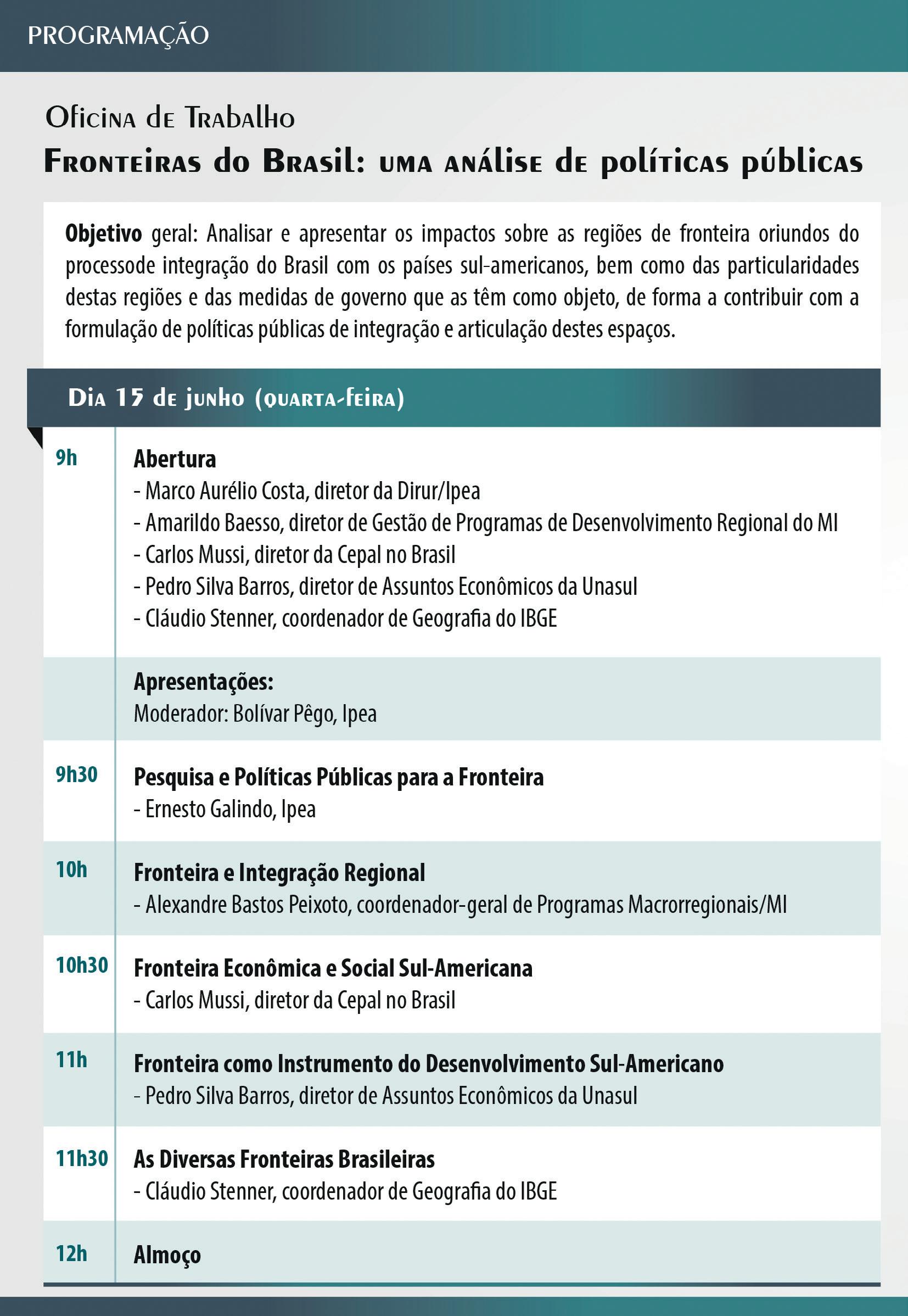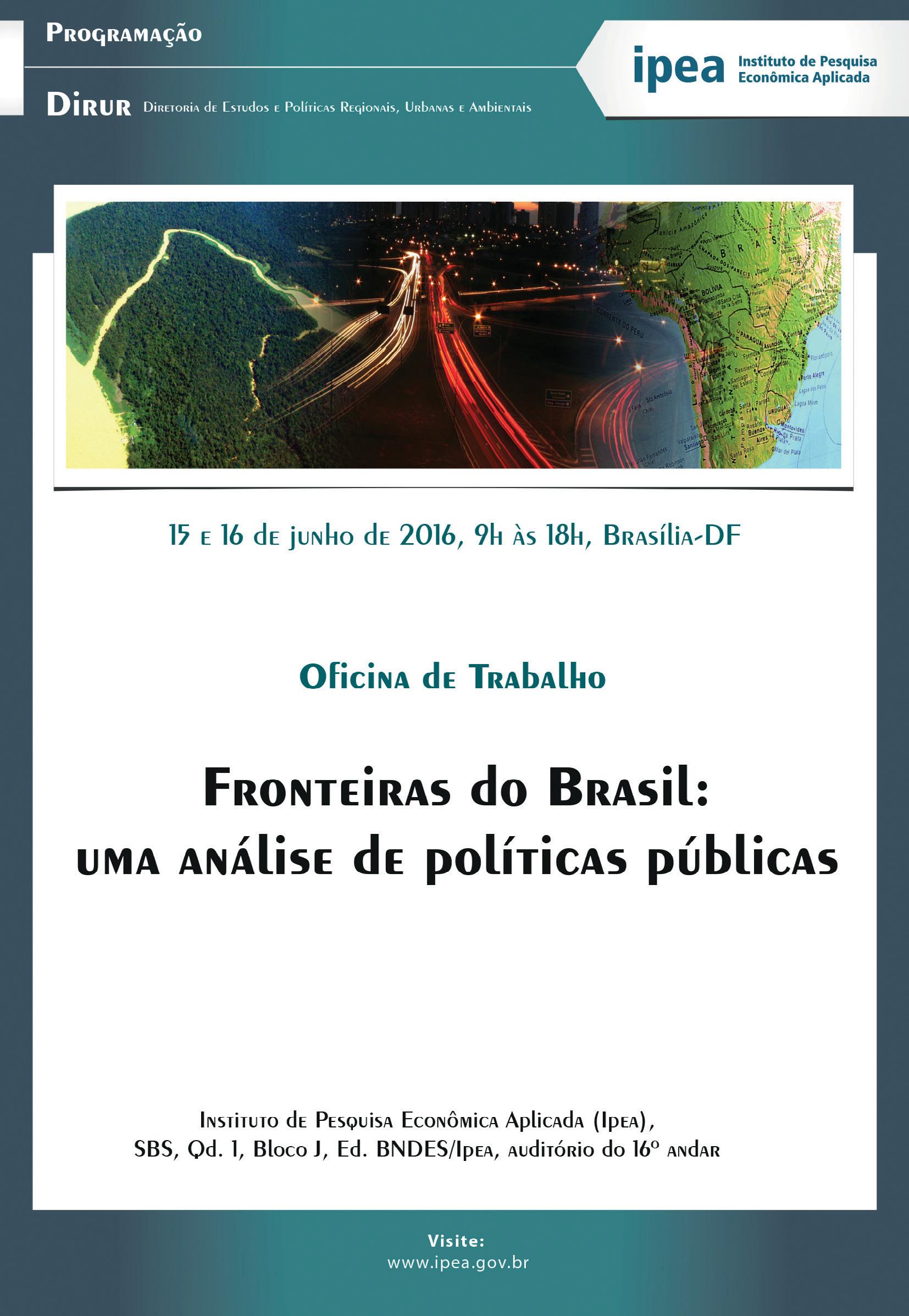 A oficina de trabalho Fronteiras do Brasil: uma análise de políticas públicas reuniu representantes de diversas instituições nacionais e internacionais, bem como diferentes agentes locais e regionais, que tratam de temas relacionados ou que abarcam o recorte fronteiriço brasileiro. Essa oficina se constituiu em um rico espaço de reflexão e diálogo para a cons trução de conhecimento sobre a realidade da fronteira brasileira, nas suas mais diferentes regiões, e para a busca de subsídios a futuras atividades do projeto Fronteiras do Brasil, sob realização do Ipea em parceria com o MI.