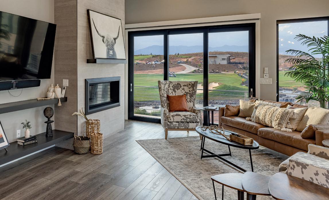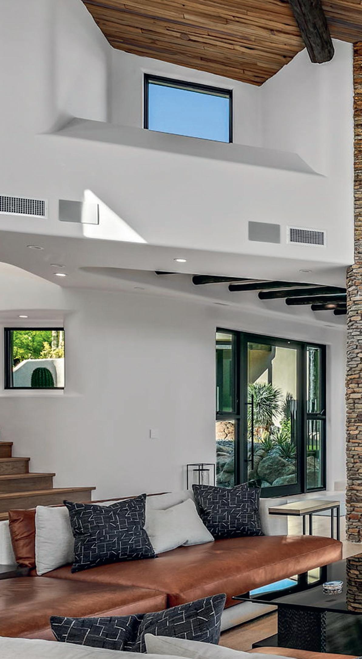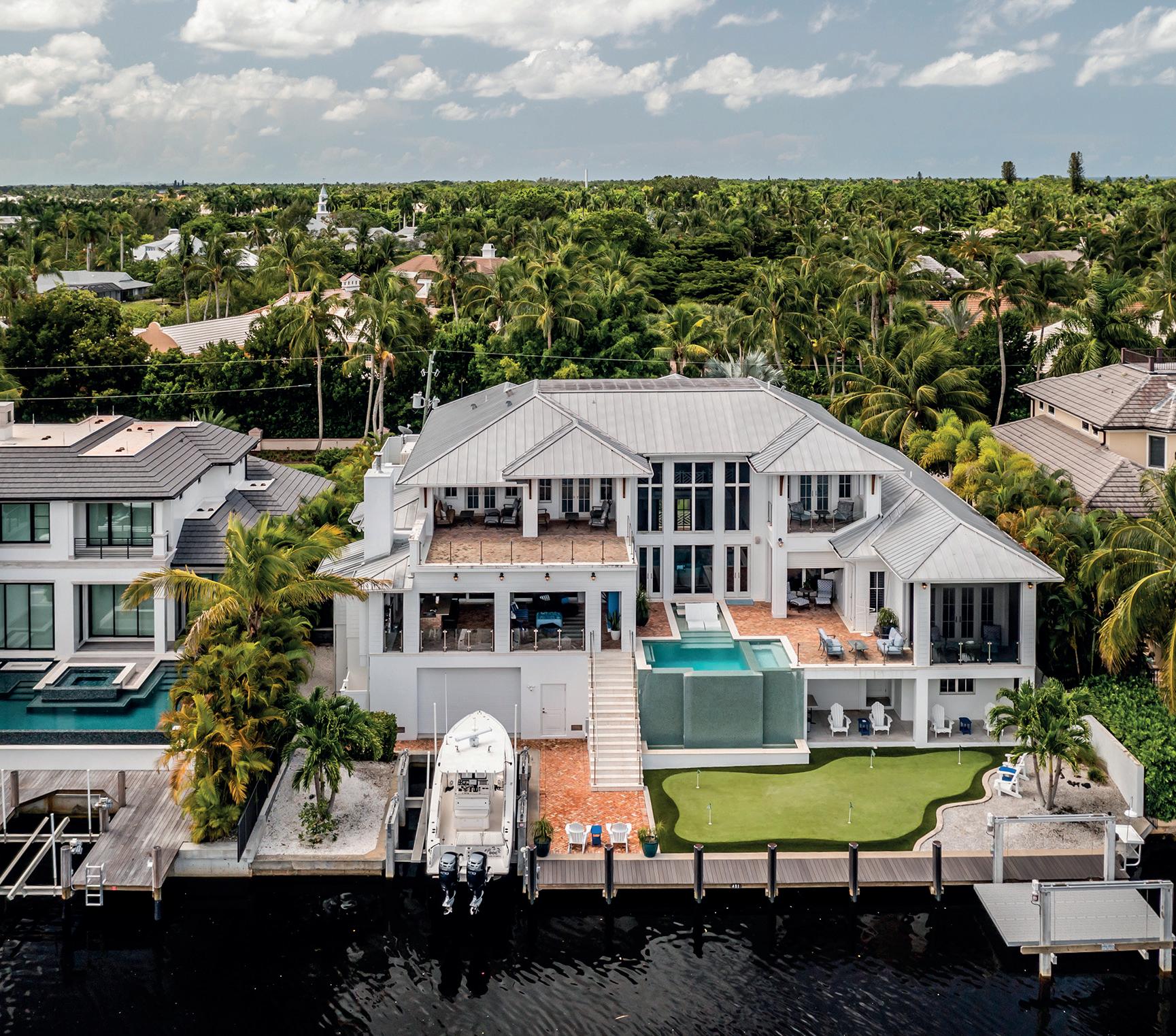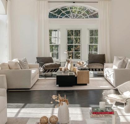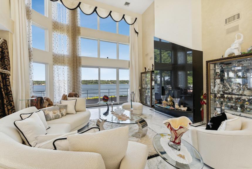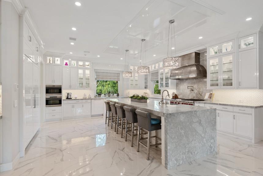 and much more. The kitchen opens to the incredible living room, which is ideal for family game nights and entertaining at its finest. No expense was spared in the amenities of this home, including the 10-seater, Gatsbyinspired movie theater. In addition, there is a fully equipped gym with a dry sauna and walk-in wine room with a 1,200-bottle capacity. The exceptional backyard also features an infinity pool with custom mosaic tile, a hot tub, putting and chipping green, extensive outdoor lighting, screened patio with gas fireplace, BBQ area, along with space and plans for a pickleball court.
