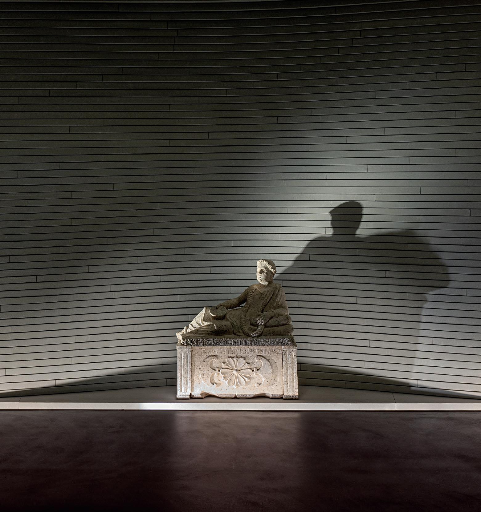 cinerary urns, vases, jewelry and bronzes. Above ground, more Etruscan sculptures are shown in dialogue with modern works by artists such as Alberto Giacometti, Pablo Picasso, Andy Warhol and Giulio Paolini.