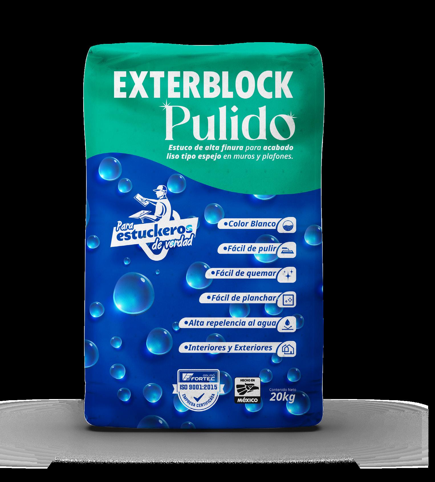 Mezcla de cemento portland, aditivos químicos de alta calidad y agregados minerales extrafinos diseñados especialmente para dar acabados súper lisos tipo espejo que proporcionan alta resistencia al exterior e interior, sustituyendo al yeso tradicional y pastas para acabados lisos. Se usa como acabado final en muros y plafones que previamente sean estuckeados con estuco EXTERBLOCK, INTERMURO o directamente en acabados finos o lisos tradicionales.