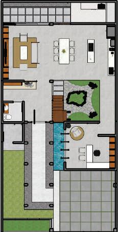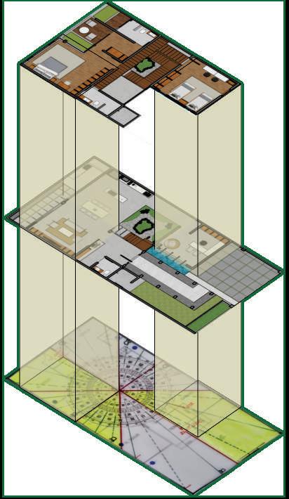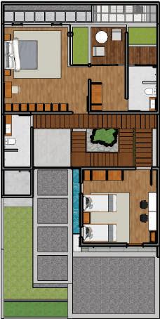 Pengolahan ketinggian bangunan sesuai dengan kebutuhan, serta penambahan kolam renang (untuk rumah orang tua, berupa jacuzi) di area terbuka.