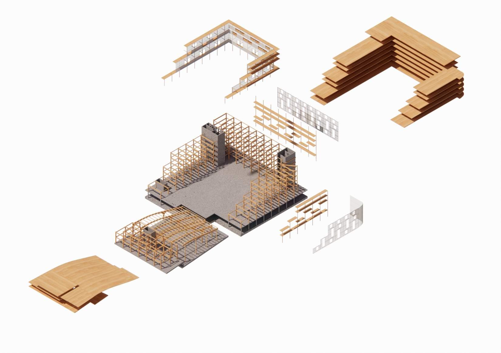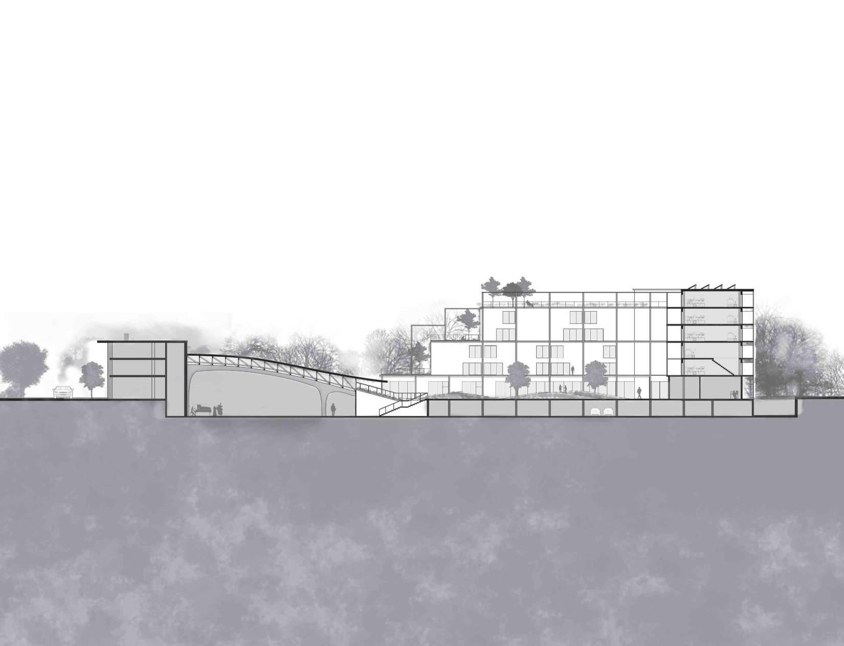 Lifting up the forest floor creates a more open, public amenity space on the ground floor