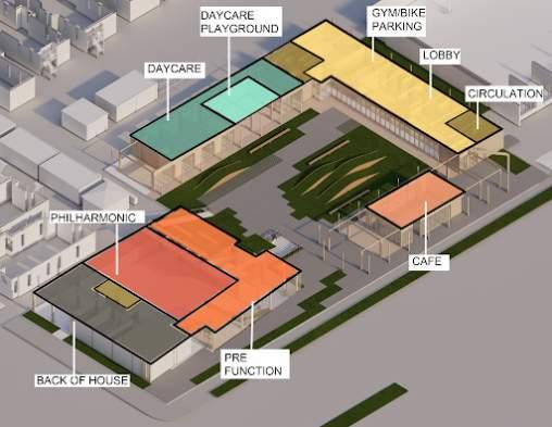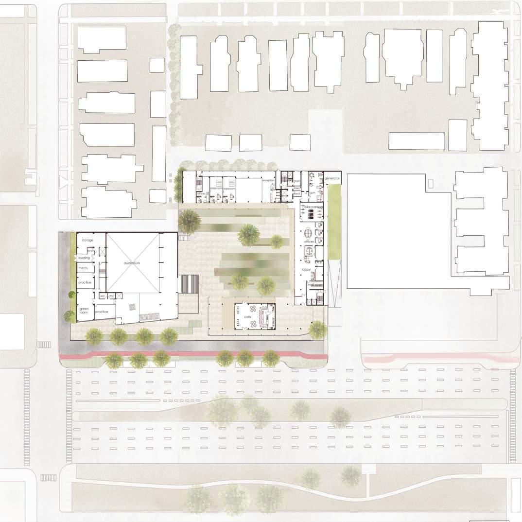 These mixed-use affordable housing units and Chicago philharmonic respond to the social needs of the surrounding community, which primarily consists of single parent households; it acts as a place of cultural fusion and exchange for these families. The green space that occupies almost the entire site ensures a visually continuous activity space, and provides active areas for children, parents, and community members.