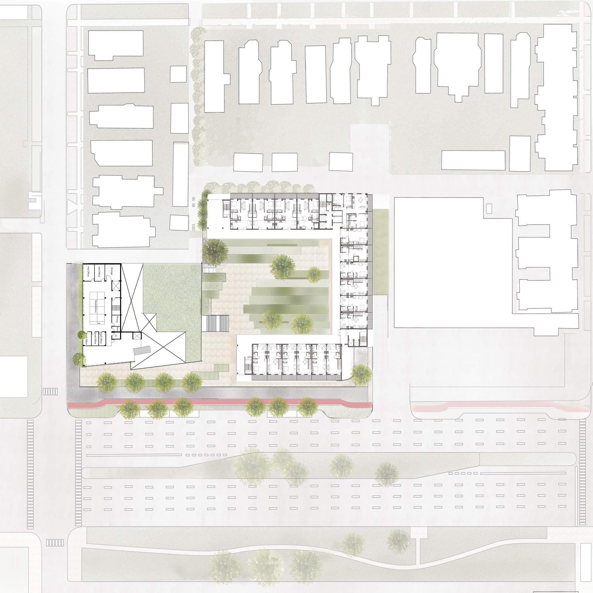 The central green space is the focal point of the site. The public space and its entrance are wrapped around it to create a more private and open activity space.
