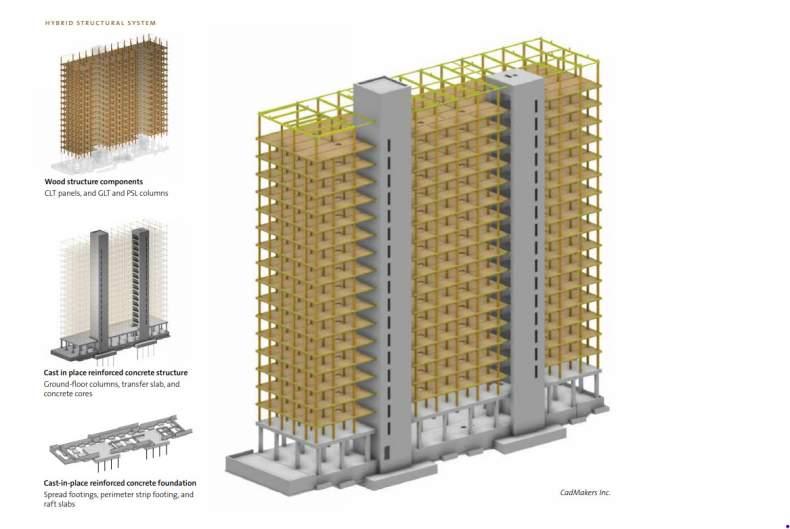 Brock commons tallwood house located at the University of British Columbia. The foundation, ground floor, and stair/elevator cores are reinforced concrete, while the superstructure is composed of cross-laminated timber (CLT), floor panels supported on parallel strand lumber (PSL), and glue-laminated timber (GLT) columns with steel connections. The construction details and the concept of sustainability are used in our design.