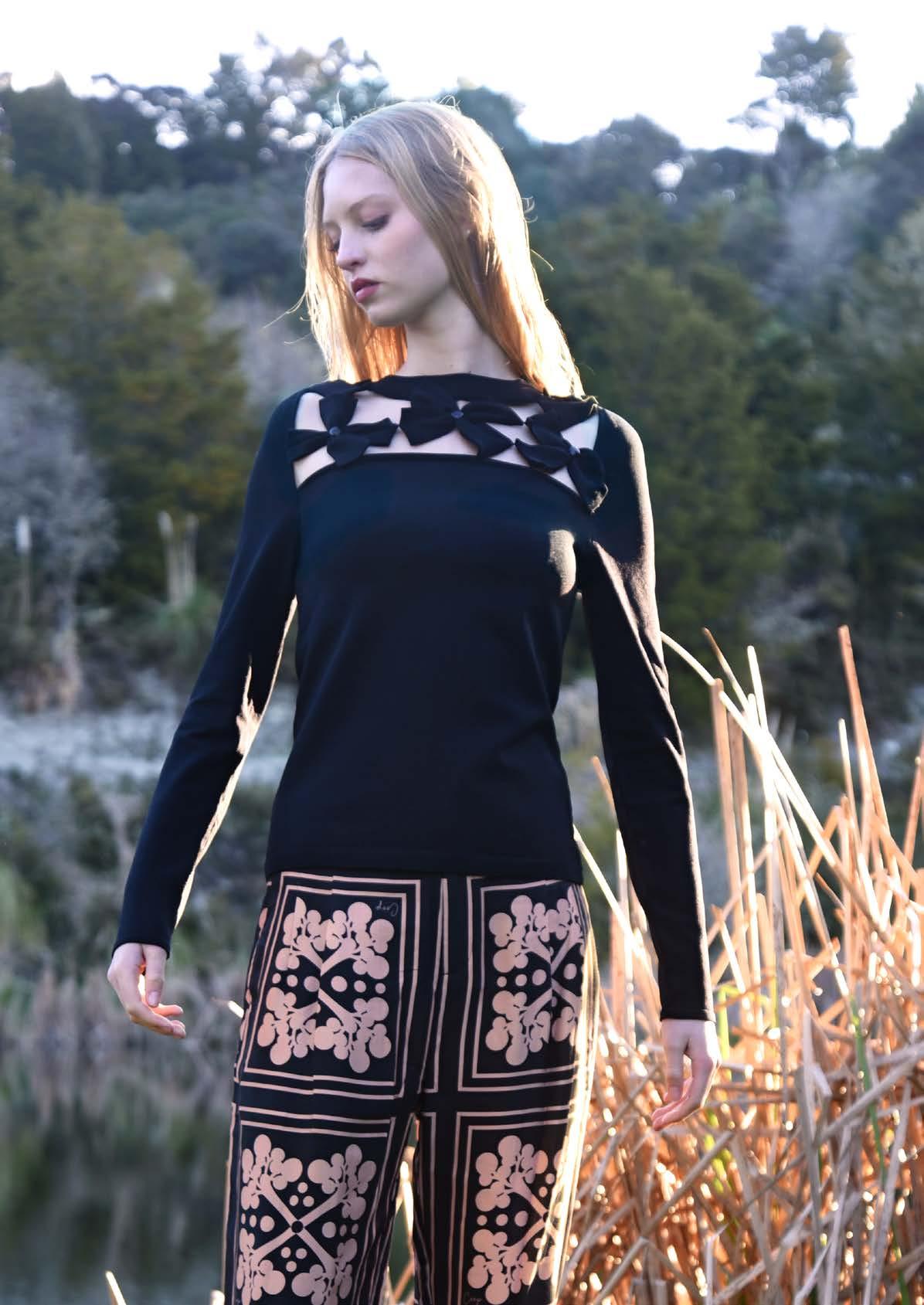 CP2972-24 • TOP BLACK XS-XL | RRP $249 PETAL PERFECT RAYON NYLON KNIT