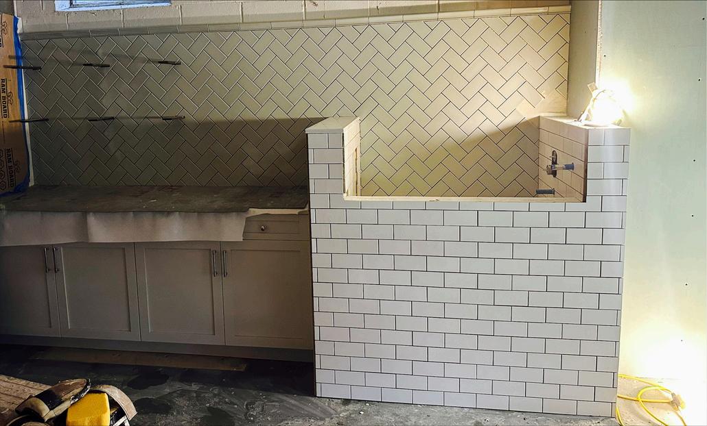 Next steps: cabinetry installation, countertops, and decorative lighting