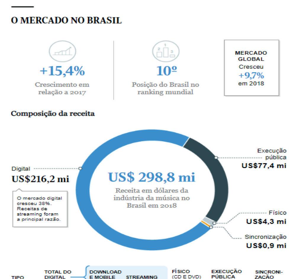 Segundo o relatório “Global Music” da IFPI – Federação Internacional da Indústria Fonográfica, em 2018, as receitas de música no mundo foram de US$19,1 bilhões, com crescimento de 34% nas receitas de streaming e América Latina, especialmente o Brasil, apresentando maior crescimento regional pelo quarto ano consecutivo.