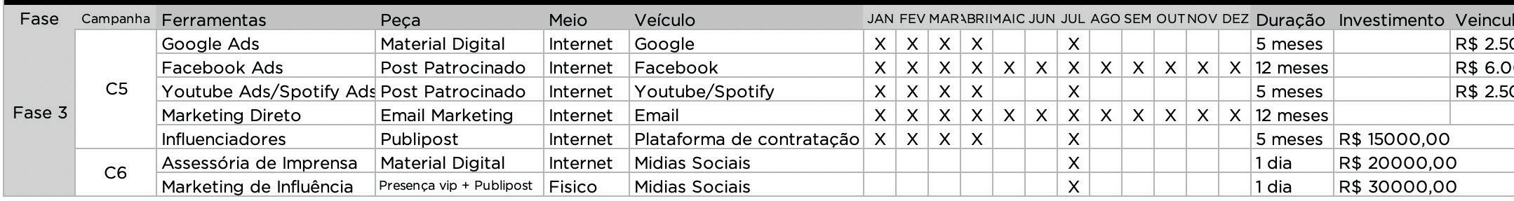 10.1.5. Cronograma e custos .................. 182 10.1.6. Plano de mídia ....................... 184 10.1.6.1. Planilha do plano de mídia ............ 184 10.1.6.2. Defesa dos meios e veículos escolhidos . 185 10.1.6.3. Defesa da frequência de inserções ..... 186 10.1.7. Briefing criativo ....................... 187 10.1.7.1. Reason Why ......................... 187 10.1.7.2. Promessa ........................... 188 10.1.7.3. Apelo e tom ......................... 188 10.1.7.4. Conceito criativo ..................... 188 10.1.8. Enxoval das peças ..................... 188 10.1.9. Estratégia de mensuração de resultados .. 193 11 . DESCRITIVO DAS DEMAIS CAMPANHAS . . . . 194 11.1 Campanha 2 (Fase 1) ................... 195 11.2 Campanha 3 (Fase 2) .................. 197 11.3 Campanha 4 (Fase 2) .................. 199 11.4 Campanha 5 (Fase 3) .................. 201 11.5 Campanha 6 (Fase 3) .................. 203 12 . DISTRIBUIÇÃO DA VERBA . . . . . . . . . . . . . . 206 12.1. Em relação ao composto de comunicação . 207 12.2. Em relação às fases da estratégia ....... 208 12.3 Em relação às campanhas ............. 209 13 . VIABILIDADE ECONÔMICA . . . . . . . . . . . . . . 210 13.1 Investimento inicial .................... 211