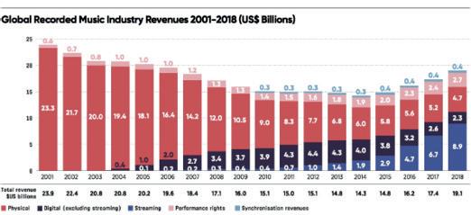 Em função de todas as mudanças de hábito de consumo provocados pela internet , o que inclui a pirataria e o P2P (compartilhamento de arquivos diretamente entre usuários), a música perdeu seu valor como produto. Esse valor foi recuperado pelo mercado digital, primeiro via download , que cresceu por muitos anos (e em 2018 caiu 21,2%, uma tendência que vem se mantendo), e mais recentemente via streaming . O streaming oferece algo que a pirataria nunca conseguiu oferecer, em um custo bastante acessível.