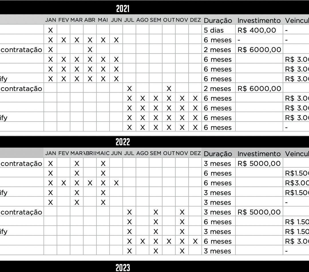 Tabela 1: Dados do macroambiente demográfico 30 Tabela 2: Dados do macroambiente econômico .. 34 Tabela 3: Dados do macroambiente político legal . 37 Tabela 4: Dados do macroambiente tecnológico . 39 Tabela 3: Dados do macroambiente sociocultural . 41 Tabela 3: Dados do macroambiente natural ...... 41 Tabela 4: Relação de inscritos e postagens no Youtube e Instagram. . . . . . . . . . . . . . . . . . . . . . . 65 Tabela 5: Presença nas principais Plataformas de Streaming ..................... 65 Tabela 6: Shows ............................. 66 Tabela 7: Índice de atratividade ............... 90 Tabela 8: Matriz Ansoff ....................... 93 Tabela 9: Matriz OT (parte 1) ...................94 Tabela 12: Time-line das fases ................ 171 Tabela 13: Time-line das fases com as campanhas 171 Tabela 14: Time-line de Marketing ............. 172 Tabela 15: Visão Geral do Plano Estratégico ..... 173 Tabela 16: Plano para mídias sociais ........... 174 Tabela 17: Cronograma editorial ............... 177 Tabela 17: Tabela de Cronograma (Parte 1) ...... 182 Tabela 17: Tabela de Cronograma (Parte 2) ..... 183 Tabela 19: Plano de mídia .................... 184 Tabela 20: Resumo do investimento ........... 185 Tabela 20: Investimento inicial ................ 211 Tabela 21: Custos fixos e mensais .............. 213 Tabela 22: Ponto de equilíbrio ................ 214 Tabela 23: Fluxo de caixa (Parte 1) ............. 216 Tabela 23: Fluxo de caixa (Parte 2) ............ 217 Tabela 24: Fluxo de caixa .................... 218