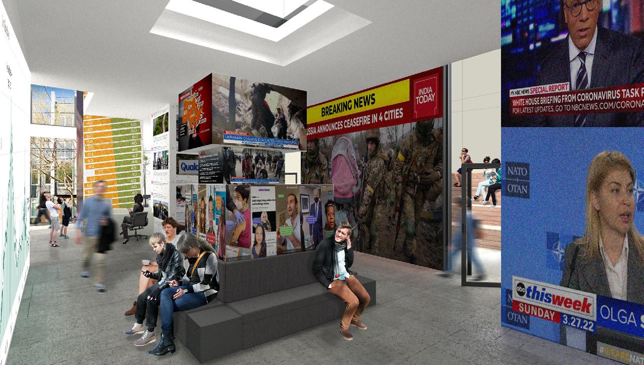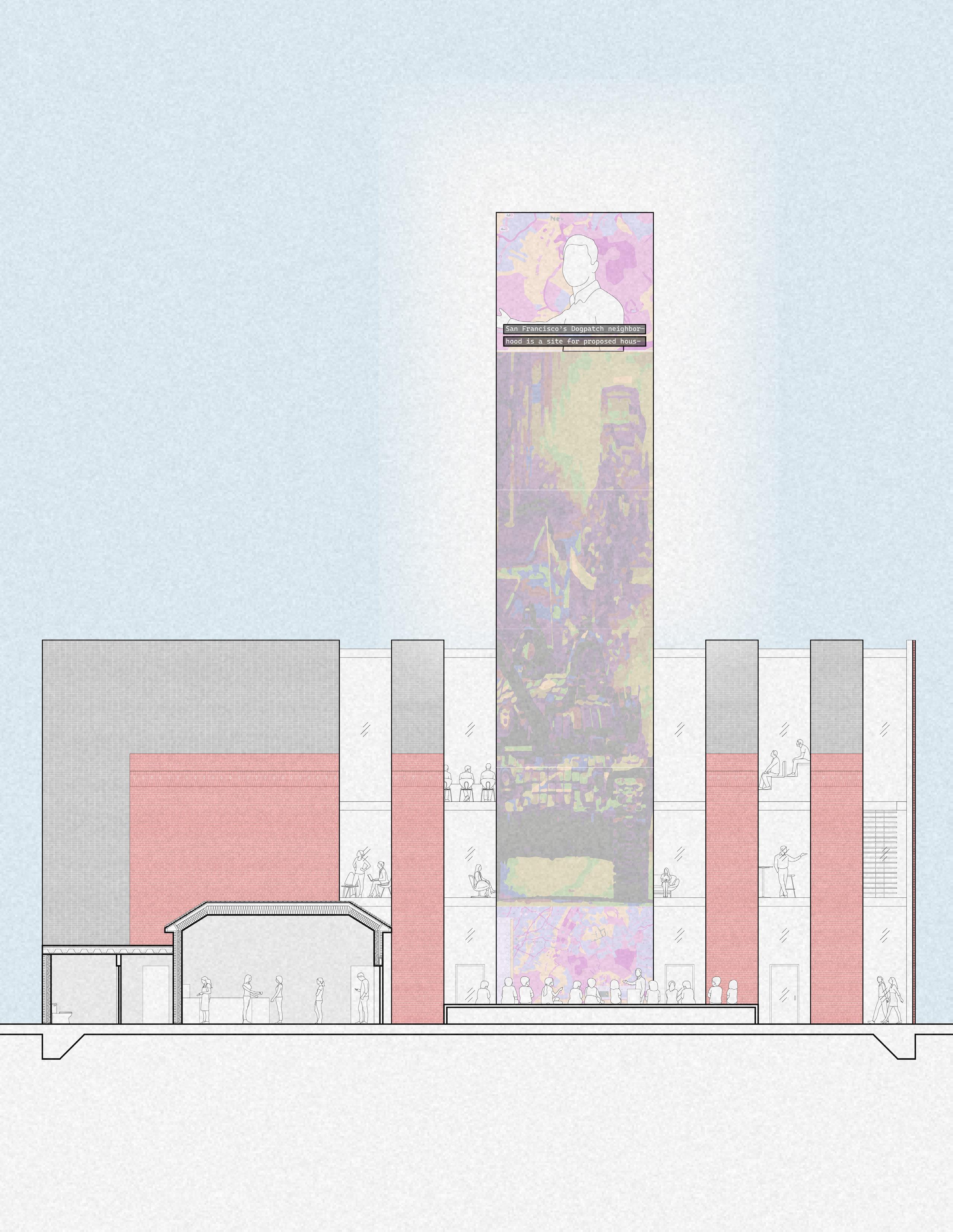 Typically, the newsroom exists as an isolated object with the public as a separate sphere. This results in a one-way relationship between the two: private newsource to public audience. As this is counterintuitive to creating a democratic space, the current firehouse gets fragmented in order to to reimagine the way news is received and discussed. The volumes that remain from the fragmentation are used to shape the space and materially are a series of screens. These display news from major sources, operate as tools to discuss the news, such as smart boards, and also display news that is a direct feed from people’s phones or of events taking place inside the building. This collection of screens that exists on the interior then accumulates to the largest volume atop the building that acts as a beacon to the street.