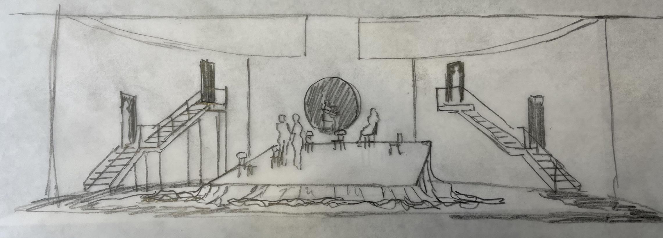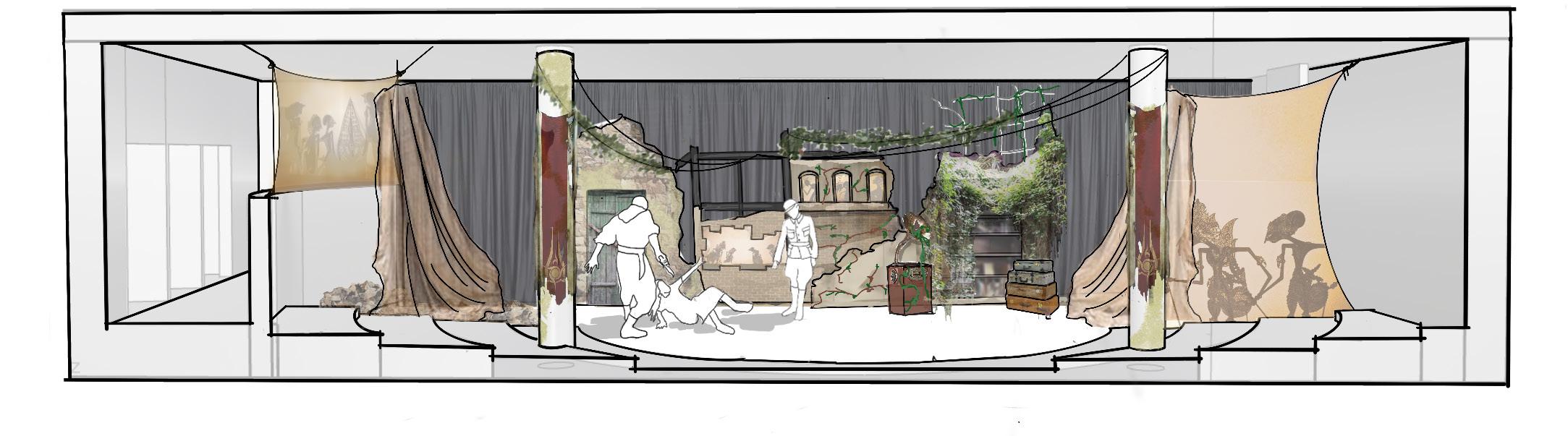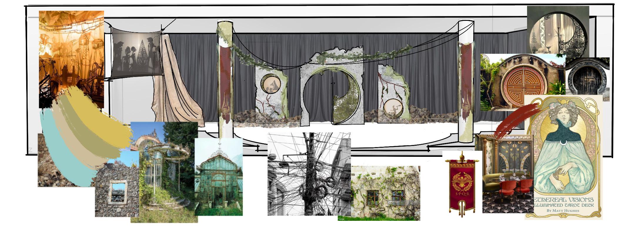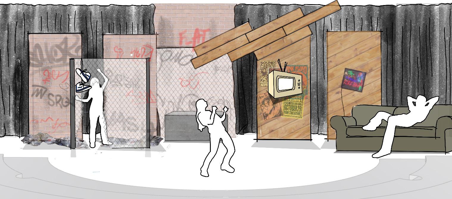 A veteran and his sons return from years of service to their country to find themselves thrust into a vicious cycle of death, rape, vengeance, and torture that seems only to end when the play does. Shakespeare’s bloodiest work, Titus Andronicus is classified as a tragedy yet is riddled with dark humor. The set sits in a stylistic limbo between fun and frightening and conveys postapocalyptic scenery with accents reminiscent of post-WWII. A bohemian civilization built upon rubble, the design also plays with ideas of the familiar and the unfamiliar, leaning into aesthetics with which we are familiar, however amplified or even commingled with aesthetics that would have never been mixed before. The integration of surfaces for shadow puppetry was essential to the set as well, providing space for insidious narration to be delivered in an ironically playful manner.