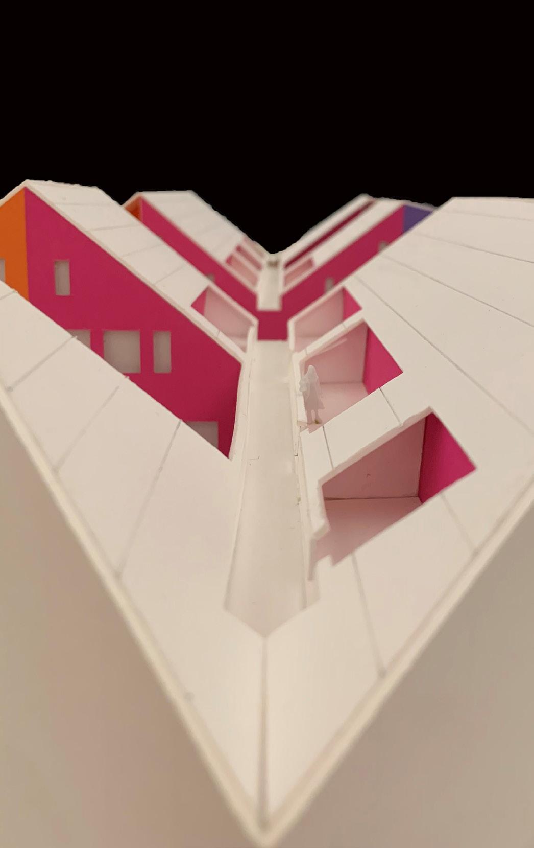A module of units and a microcourtyard is placed along a grid outlining the roof’s valleys and ridges. These modules go through a series of mirror operations across the grid lines to equally deploy outdoor space among the three user groups.