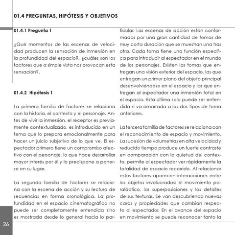 ticular. Las escenas de acción están conformadas por una gran cantidad de tomas de ¿Qué momentos de las escenas de veloci- muy corta duración que se muestran una tras dad producen la sensación de inmersión en otra. Cada toma tiene una función específila profundidad del espacio?, ¿cuáles son los ca para introducir al espectador en el mundo factores que a simple vista nos provocan esta de los personajes. Existen las tomas que ensensación?. tregan una visión exterior del espacio, las que entregan un primer plano del objeto principal desenvolviéndose en el espacio y las que en01.4.2 Hipótesis 1 tregan al espectador una inmersión total en el espacio. Esta última solo puede ser entenLa primera familia de factores se relaciona dida si va amarrada a los dos tipos de toma con la historia, el contexto y el personaje. An- anteriores. tes de vivir la inmersión, el receptor es previamente contextualizado, es introducido en un La tercera familia de factores se relaciona con tema que lo prepara emocionalmente para el reconocimiento de espacio y movimiento. hacer un juicio subjetivo de lo que ve. El espectador primero tiene un compromiso afectivo con el personaje, lo que hace desarrollar mayor interés por él y lo predispone a ponerse en su lugar.