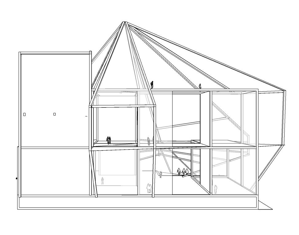 Este encaje tenía que hacerse en las tres dimensiones del espacio ya que algunos de los usos productivos (huerto-invernadero), demandan además unas alturas libres bastante considerables. Al mismo tiempo se buscaba un diseño con una eficacia funcional máxima. Para ello se decidio una zona productiva en la que pudiera estar situada una pieza más voluminosa y que resalte de la edificación.