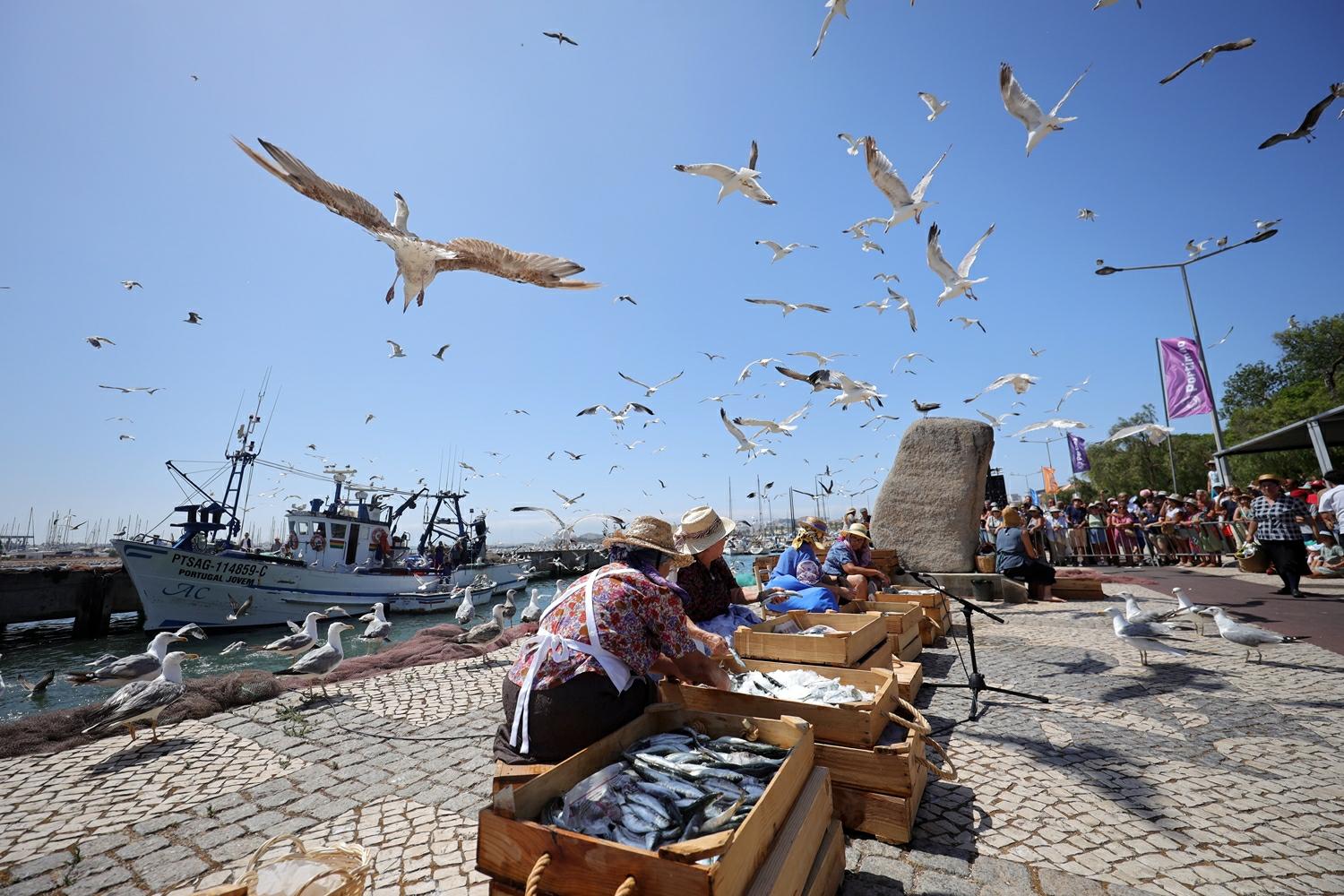 que as apanhava na muralha, sendo este despejado em caixas de imediato. Era gelado ou salgado e transportado em bicicletas, carrinhas, triciclos e motorizadas para o seu destino, enquanto as crianças desviavam sardinhas, gerando algazarra entre os presentes. Todo esse ambiente, com dinâmicas e interações próprias, atraía curiosos e turistas, proporcionando o convívio entre protagonistas e mirones, especialmente quando descarregadores de peixe assavam sardinhas para o almoço e convidavam os visitantes a provar esta iguaria tão típica da região.