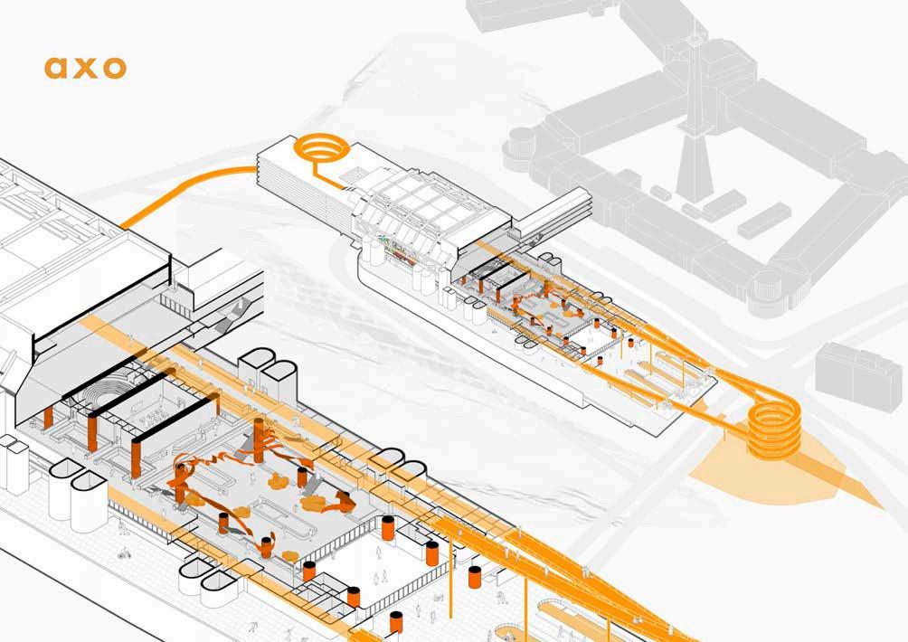 Activities include an urban garden where the community can grow crops themselves, rather than being surrounded by privately-owned farmland, a sleeping zone and a beeharvesting zone. There will be three typologies being: rooftop, attached to and in between existing buildings. Over the course of four phases the project will grow to cover the whole city. These typologies will be connected by walkways and will stimulate the people to build a relationship with the sporadic ecosystem. Burrowing the language of the surrounding industrial infrastructure strives to act as a foundation for vegetation to blossom uncontrollably and ultimately bring dynamism through fluid architecture.