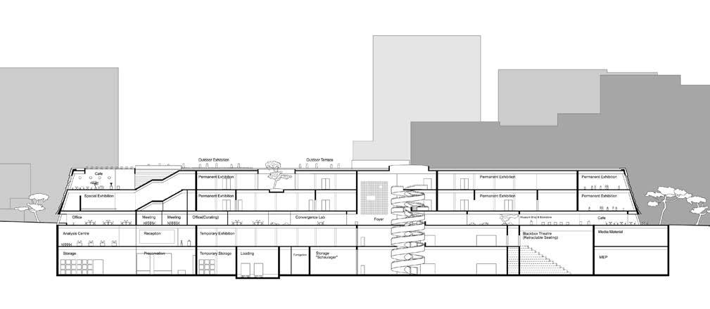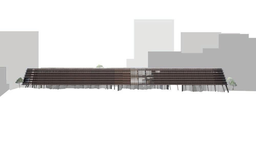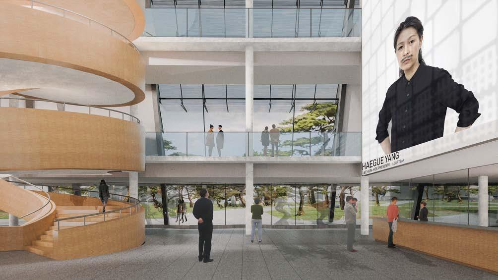 Top: East elevation, Middle: Long section showing program arrangement, Bottom: Render of the foyer looking into the park, creating a relationship between inside and nature as in Korean traitional architecture
