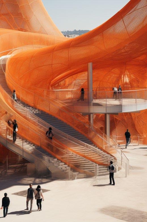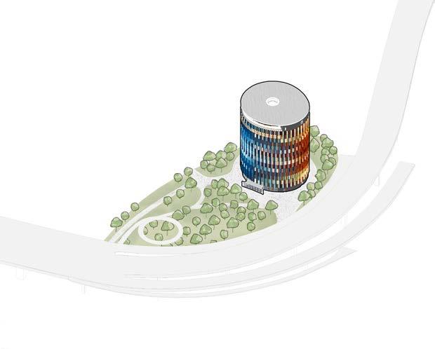 accessed via a spiral staircase. The gallery has panoramic views of the park and mountains, while underground facilities ensure the smooth movement of exhibitions. The exterior glass façade allows views of the park and the building incorporates sustainable features such as rainwater harvesting and bicycle-friendly amenities.