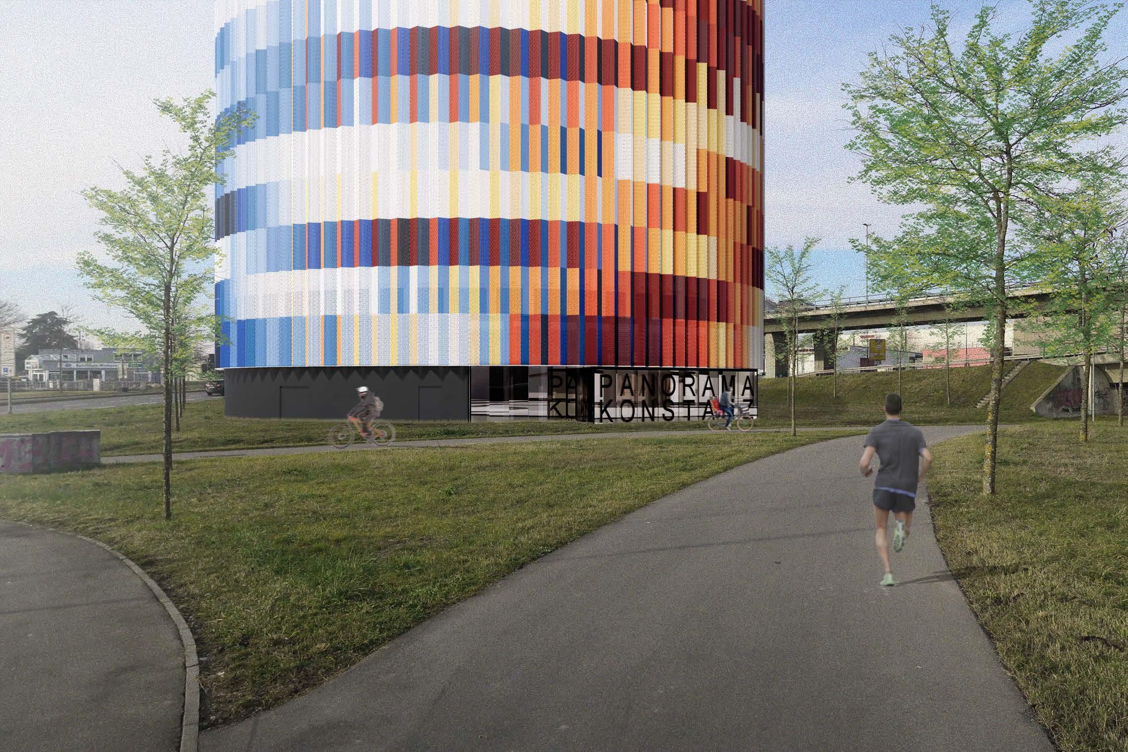 Inside, visitors experience an immersive historical panorama by Yadegar Asisi in a 30-meter-high exhibition space. A rooftop restaurant with a