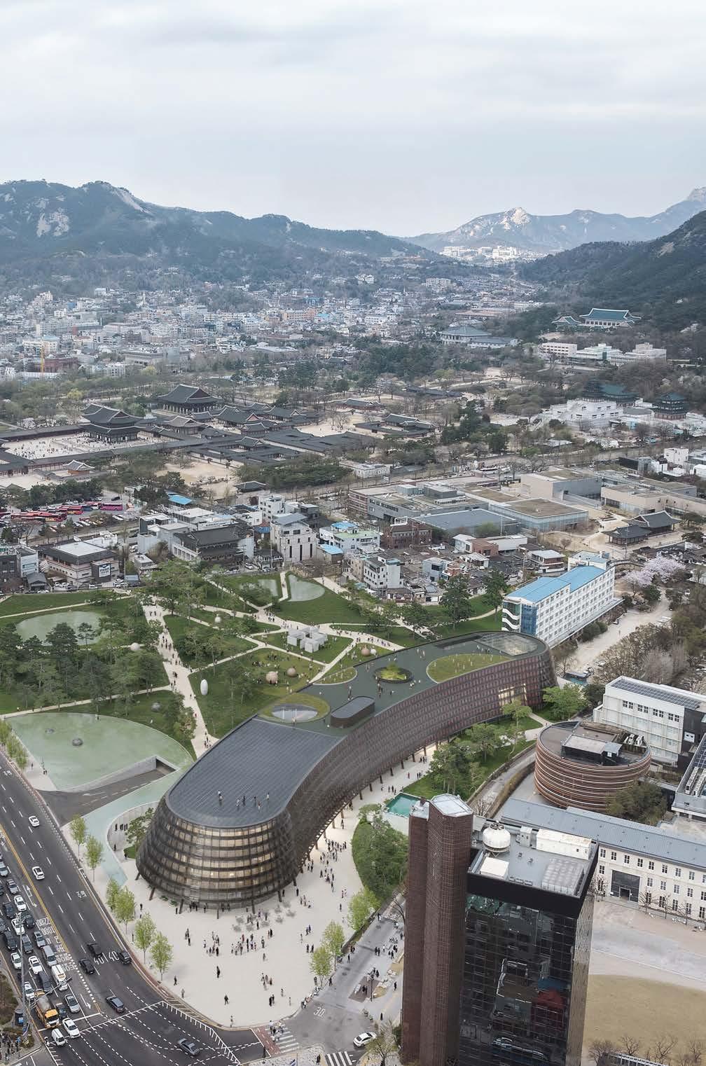 The structure is built from lightweight steel and concrete for earthquake safety and minimal environmental impact, while also emphasising prefabrication for quick assembly, all to become a modern cultural landmark in Seoul.