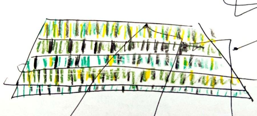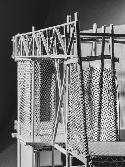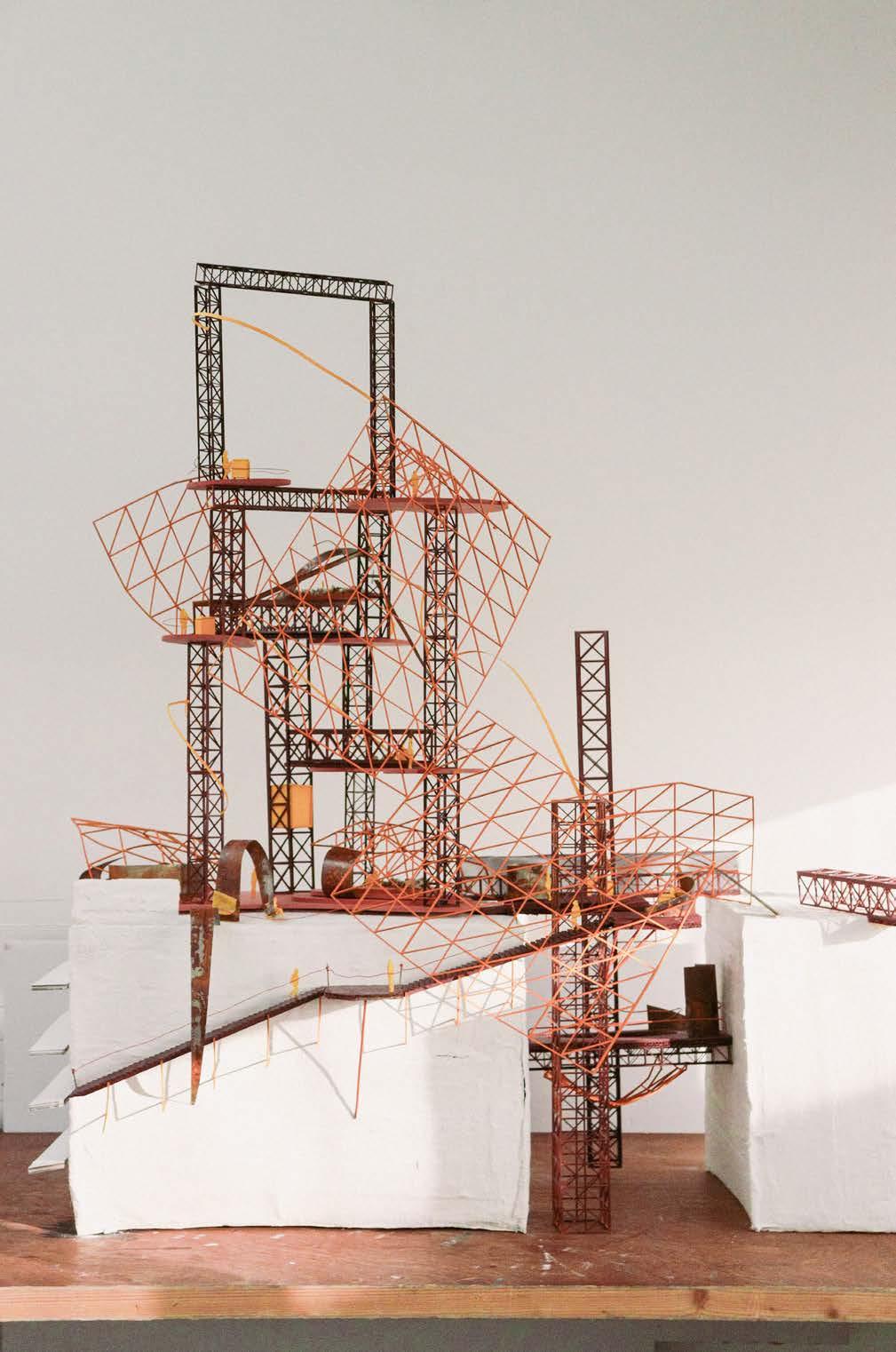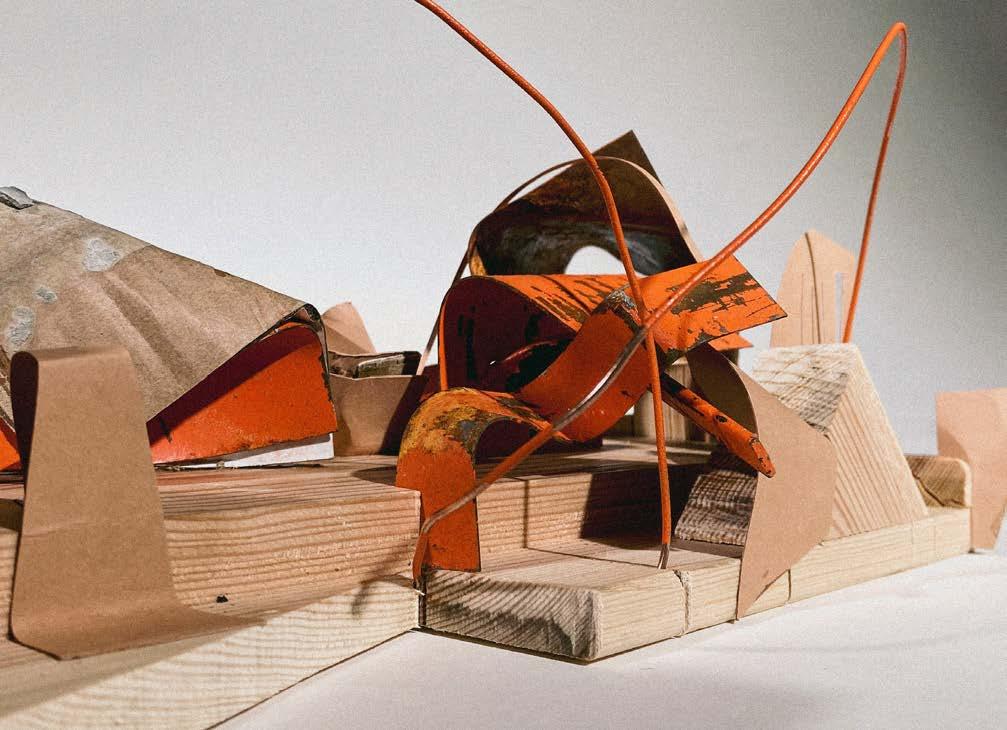 Top: Collage to show the existing landscape of rural Essex being elevated, Bottom: Concept model exploring the materiality of rusted metal