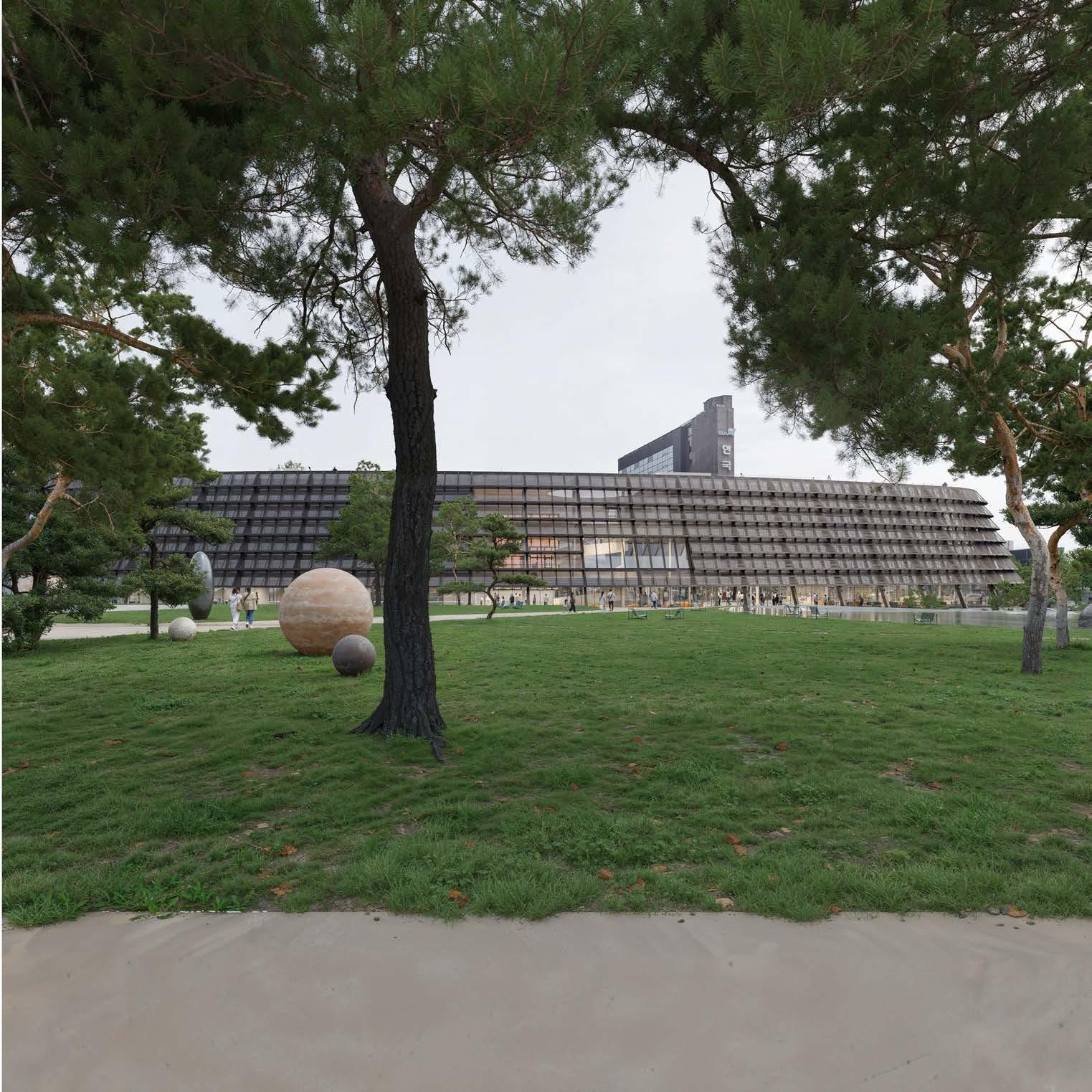 Lee Kun-hee Museum in Seoul combines traditional Korean and modern architecture. It draws on local landmarks and natural landscapes on site, featuring curved and eco-friendly design elements inspired by traditional roofs of Hanoks. The building design maximizes energy efficiency, producing more energy than is used by its extensive solar and geothermal systems to achieve a state of net positive energy.