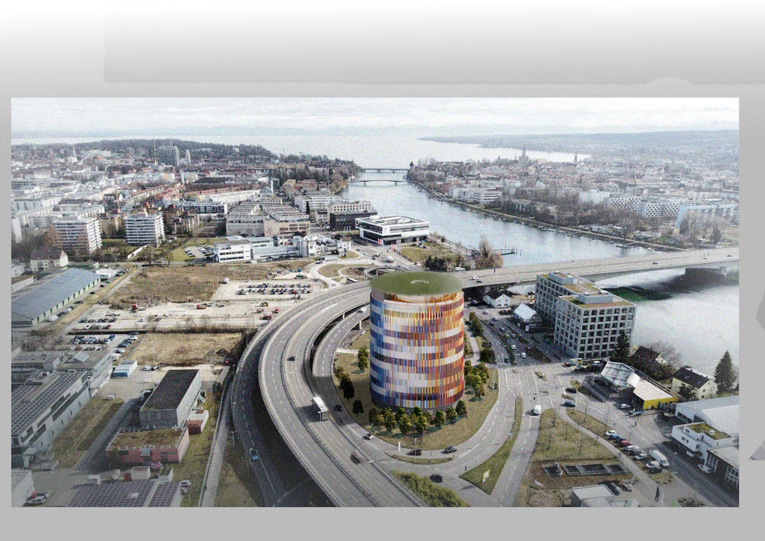 Aerial render overlooking the Lake Constance and the new panorama gallery (produced