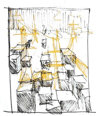 Right: Documenting the process of spontaneous model making with card, Left: Axonometric showing the concept of connected roofs with the local vernacular language of pylons