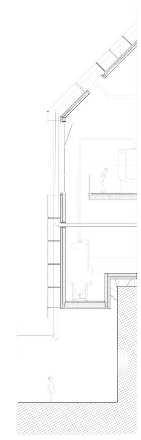 The brewery sits on two existing flat-roofed buildings on the main street, materiality of which comprises of a harmonious mixture of hard and soft. Hard, denoting the industrial language of the port (steel and concrete), and soft, referring to the warmness of the British pub culture (timber and hay).