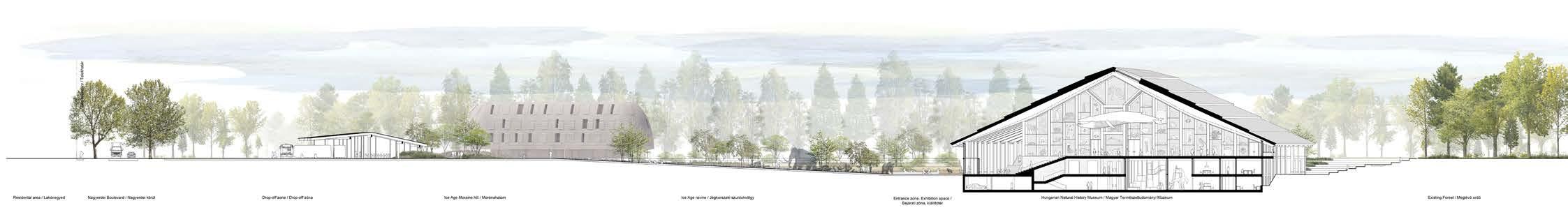 The Hungarian Natural History Museum in Debrecen aims to deepen understanding of nature, environmental processes, and humanity’s impact. It integrates landscape and architecture, featuring didactic gardens and immersive exhibits under a vast sheltering roof.
