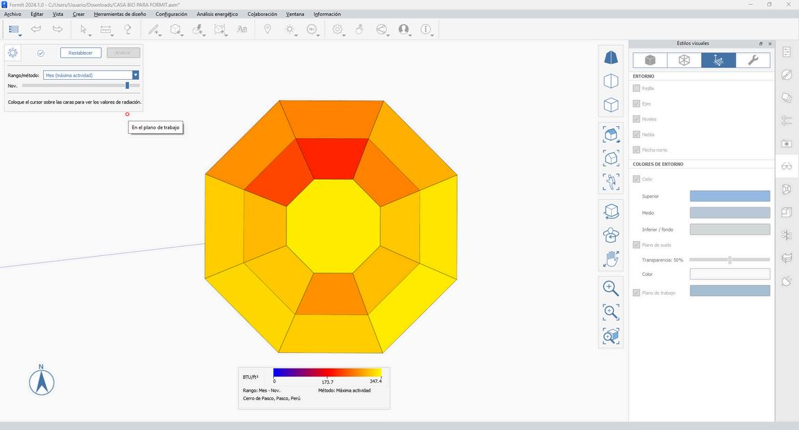 En el presente trabajo se realizara una vivienda bioclimática ubicada en el Departamento de Pasco, en la ciudad de Cerro de Pasco, donde el clima suele ser muy frio en la mayoría de meses. Para la ejecución de este proyecto se va a tener en cuenta las herramientas que se utilizo dentro del curso, esto nos dará los recursos necesarios para las estrategias que se utilizaran para la vivienda y el confort que debe tener. Dentro de este documento se dará a conocer las herramientas y como se tomara en cuenta en el proyecto propuesto. Al culminar se dará una conclusión del proyecto como recomendaciones.