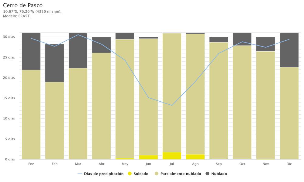 El Cerro de Pasco se caracteriza por un clima frío y seco, típico de la alta montaña. Su altitud, que supera los 4300 metros sobre el nivel del mar,influyedirectamenteenlascondicionesclimáticasdelaregión.