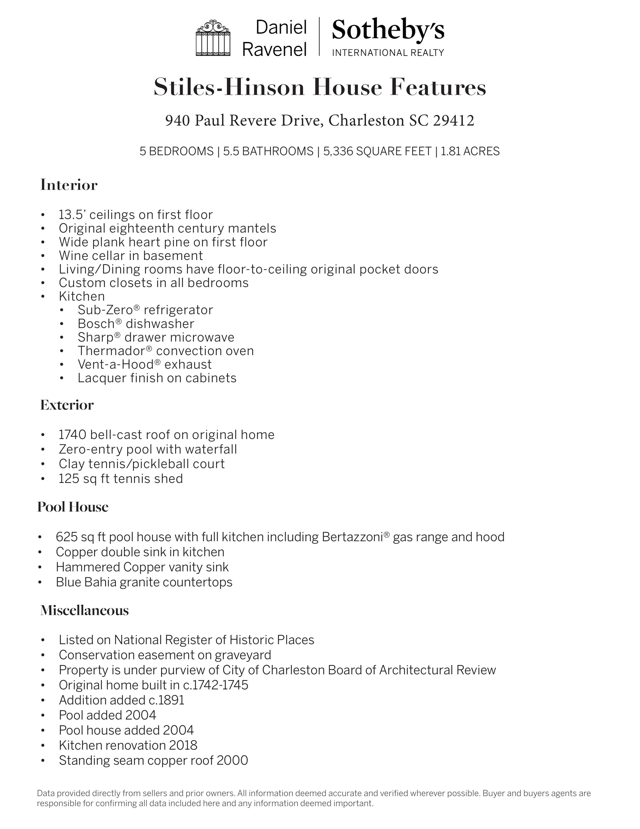 We are pleased to present the original Stiles Point Plantation home on James Island in Charleston, SC Originally constructed in c 1742 1745 by Benjamin Stiles it remains one of James Island's oldest dwellings The eighteenth century architecture is masterfully evident with its original 1740s bell cast roof, original footprint, and original mantels This portion of the home currently represents a family room downstairs and the fifth bedroom or study upstairs with an en suite bathroom.