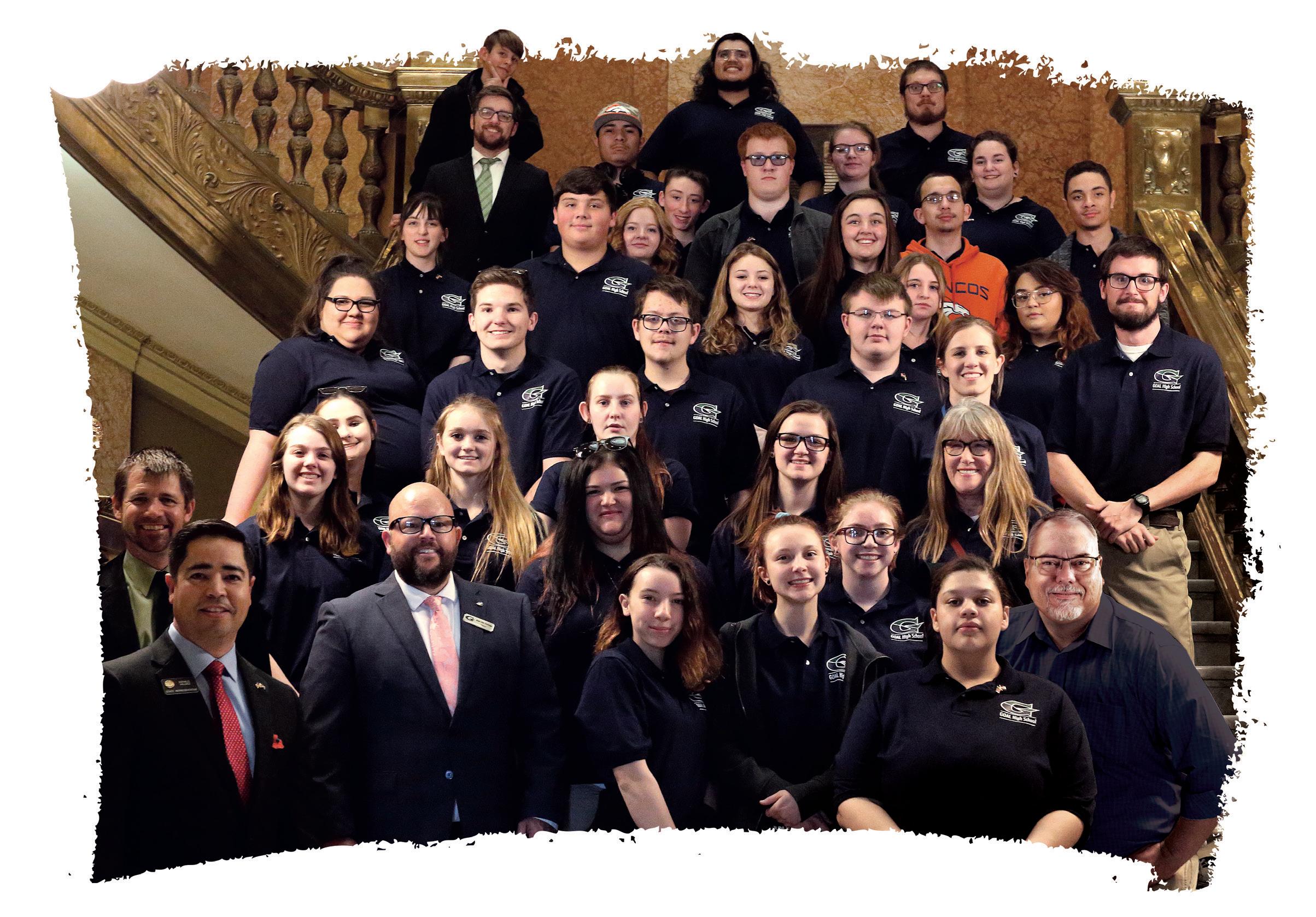 GOAL High School students and staff on their annual visit to the Colorado State Capitol Building in Denver, Colo. Pictured at lower left is Colorado House Representative Donald Valdez.