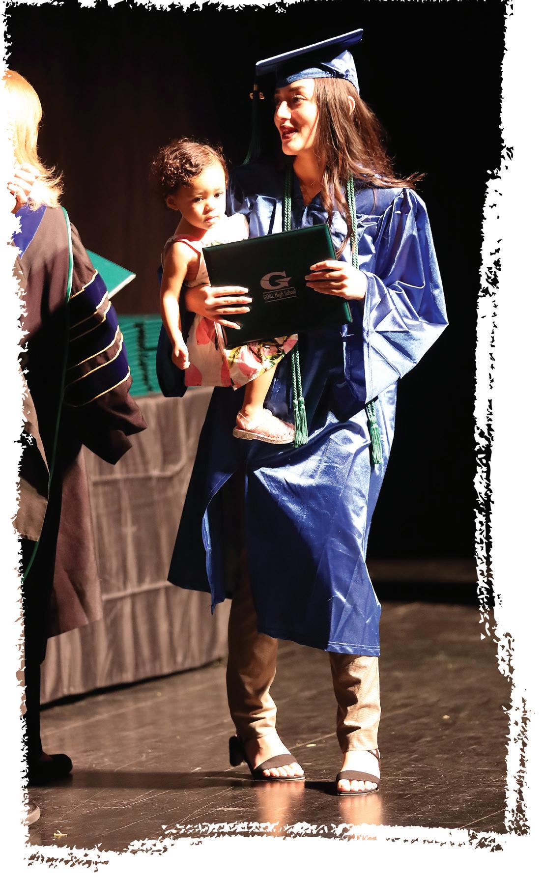 A happy GOAL graduate celebrates with her little one. GOAL specializes in removing would-be barriers to graduation.
